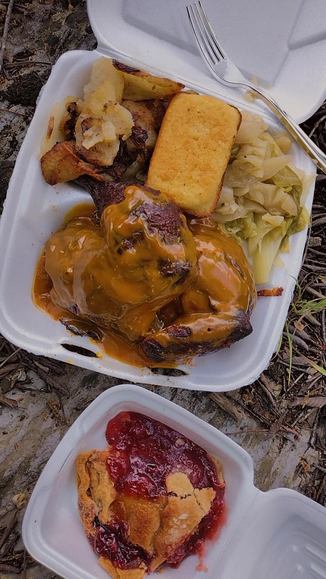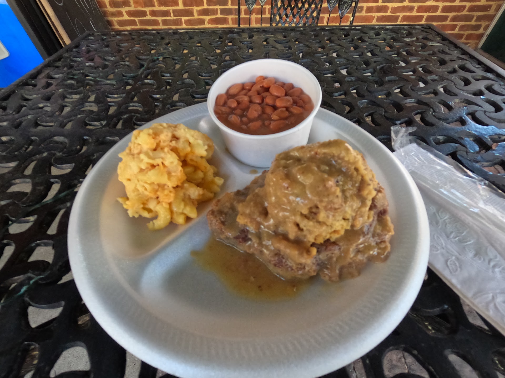 The food is amazing. I got mine to go, in a sectioned foam container. There was a pile of each of the sides (each section was filled and overflowing slighty), a half a chicken, smoked and smothered in a BBQ sauce with a decent kick to it (starts sweet, then the kick hits you, then the wood smoke). I thought I didn't like green beans with potatoes, but I just never had them fixed right - these are great. And the baked beans are actually BBQ beans, not so sweet, and with meat and great flavor. They also had a mixed veggie dish (squash, etc) and macaroni and cheese. And they also had ribs, at the same price as chicken.