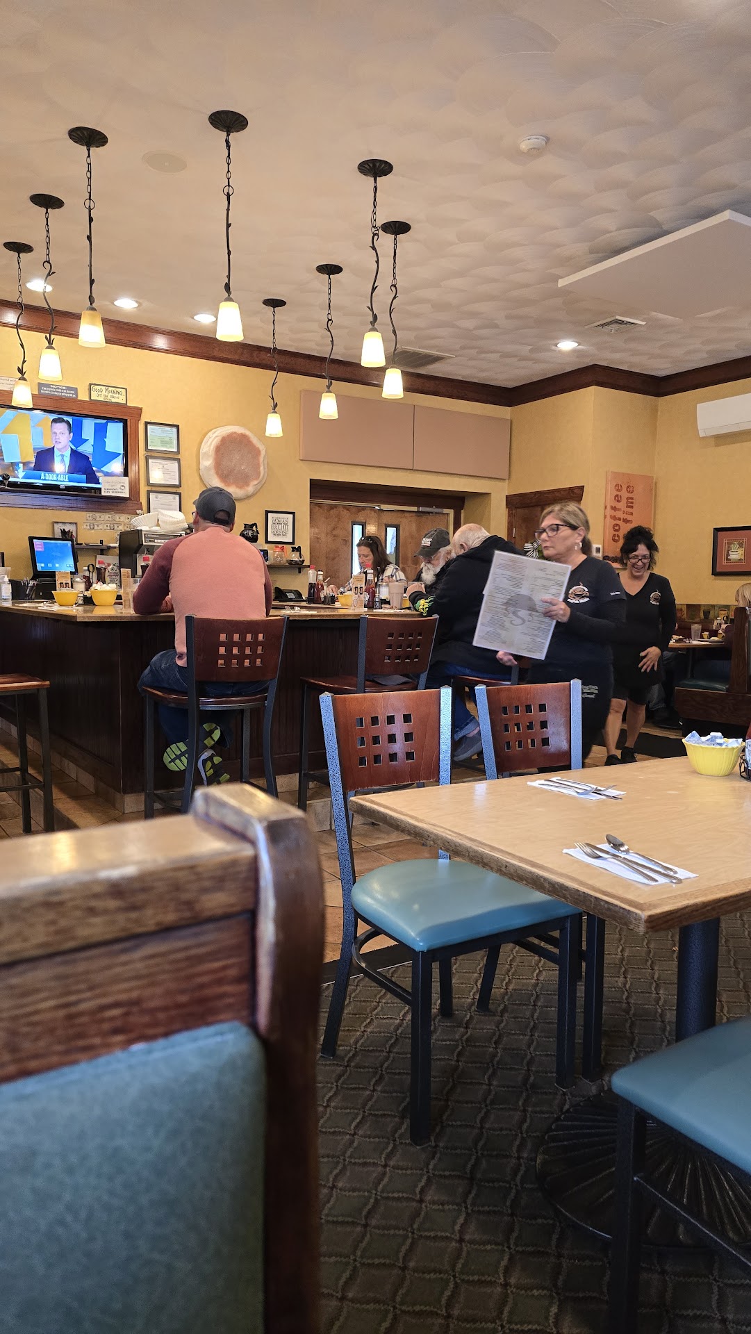 The atmosphere at the english muffin is warm and inviting. The restaurant is cozy, with plenty of seating.