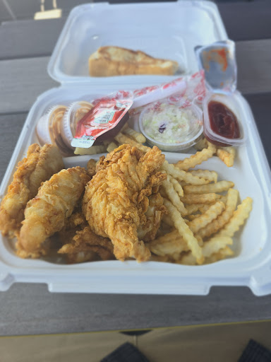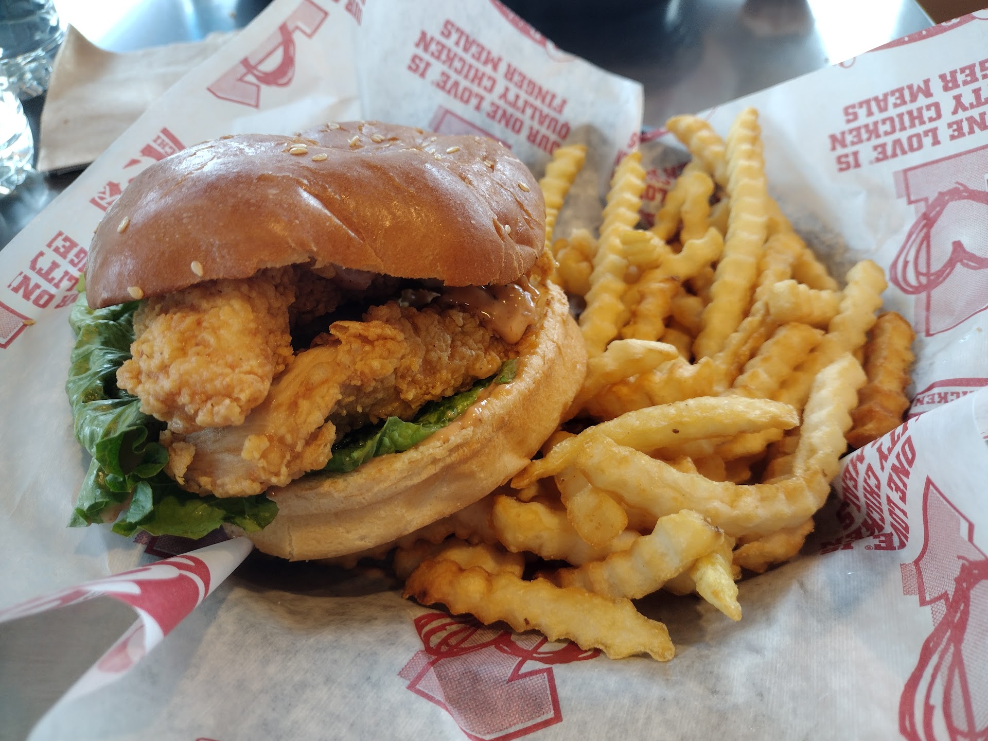 3 finger combo about $12…I love chicken, especially fried chicken. So I was excited to finally check this place out. My visit was a Weekday right when they opened there was only 1 car ahead of me. Staff was very professional although it pains me to have to hear them have to say “have a cluckey day” etc. that type of corporate script nonsense. Super cringe, But they did great. Food was hot and fresh. I ordered just your basic 3 finger combo. I’m not a crinkle cut fry fan they remind me of school cafeterias. They were ok, maybe if you like to slather things in ketchup you’ll like them. You get a big griddled piece of bread, maybe a southern thing but I wasn’t a fan. I mean it’s just a big piece of bread lol I’d rather a biscuit any day. Chicken quality was great, very tender & crispy. But I will say I found them to be kinda bland & small. I don’t understand why they don’t have a special seasoning blend for their fries or chicken, their seasoning is just a tiny amount of salt. That’s it. Although the dipping sauce was tasty. Overall to me there wasn’t anything special about this food & at $12 for a small lunch it just wasn’t a great value to me honestly. For me it was a one and done visit unfortunately. I genuinely have no idea how these guys have so many franchise locations with so many better options out there. I guess people must love it. To me it was about 6.8/10...