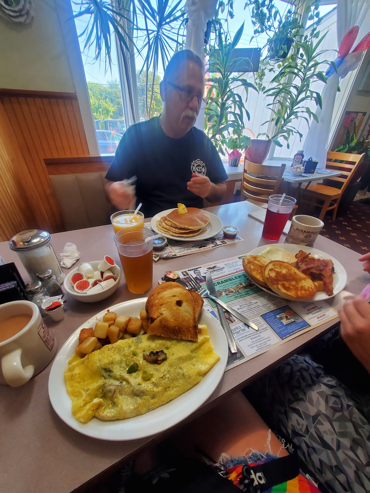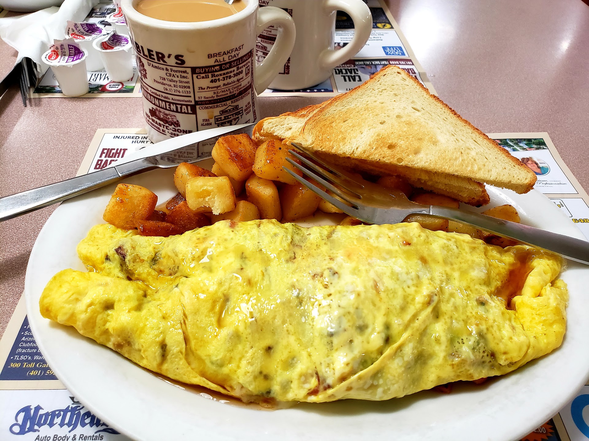 A little hesitant to post my review due to the owners behavior, but it won't stop me. We dine at many breakfast restaurants across Northern RI looking for the best ones, and unfortunately Scramblers wasn't my favorite. The price was great, service and waitresses are very friendly, but the food had some left to be desired. Home fries could be fried longer for a crisper exterior, and seasoned a little more heavily for more flavor. Eggs were tasty bit I did unfortunately get some shell in mine. Bacon was good, I ordered ham as well but received sausage instead - no problem, sausage was fine as well. Pancakes were fluffy but served with cold, unspreadable butter (pancake wasn't hot enough to melt it either). Overall fine, just nothing much stand out about it when there are so many breakfast options in RI. I'm also weary of any restaurant that has fruit flies - big red flag for those who know!