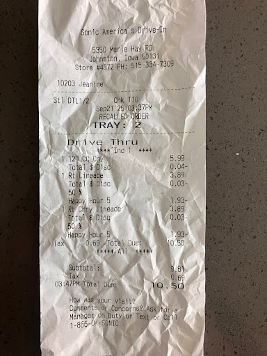 After we got our order, we parked in the lot to eat. Discovered they gave us either all medium fries or all larges. I only ordered 2 large fries and one medium. Either way, the fries in the fry boxes were not even completely filled. And on top of that they gave us unsweetened tea when I’ve ordered sweet tea 😅 I had to go the front part just to wait again for them to correct their mistake and on top of that no real customer service when fixing their mistake. But I wasn’t gonna expect much at that point. I’ve honestly receive much better service at McDonald’s and Wendy’s! And it’s cheaper than Sonic! I spent $44.22 👀👀👀 might as well had sat in an actual sit in restaurant and tipped a server that would’ve given me and my family exceptional service!