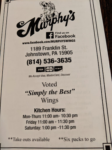 Read moreAs iconic as the floods of Johnstown, Murphys wings are a must have. For 30 plus years I have eaten and had libations at Murphys and I think every single time I was greeted by the owner. Not in many places does that happen.