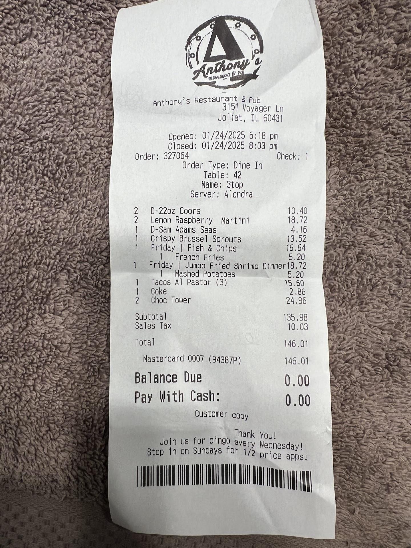 Read moreFriday night and the vibe was as flat as a pancake. The staff huddled at side tables, looking like they were on a break from life itself. Where do I even begin? The atmosphere was a dismal kind of dead. I wanted to bolt, but my companions made that tricky. So, I plopped down and ordered some appetizers. Only one showed up, and for some bizarre reason, the second never made an appearance. They didn’t charge me, and honestly, I was relieved after seeing what they served. Then came the Fish and Chips—now, we all know what that should entail, right? Four sad pieces of fish on a bed of shredded lettuce? No chips or fries in sight! I asked about the missing fries, and she finally brought them out, but guess what? I got charged for those “chips” on the receipt. Seriously? Fish and Chips? And while she was at it, she managed to spill salsa all over my jacket. She noticed and casually asked if I wanted a napkin. Oh sure, let’s just leave the salsa party on my jacket! Everyone’s meals were a disaster—tiny portions and way overpriced. After today’s experience, I wouldn’t return even if they offered free food. Looking at the low ratings, I should’ve trusted the reviews and stayed away. Lesson learned. I just wanted to share the receipt because if you looked at it, you’d think we left stuffed and happy....