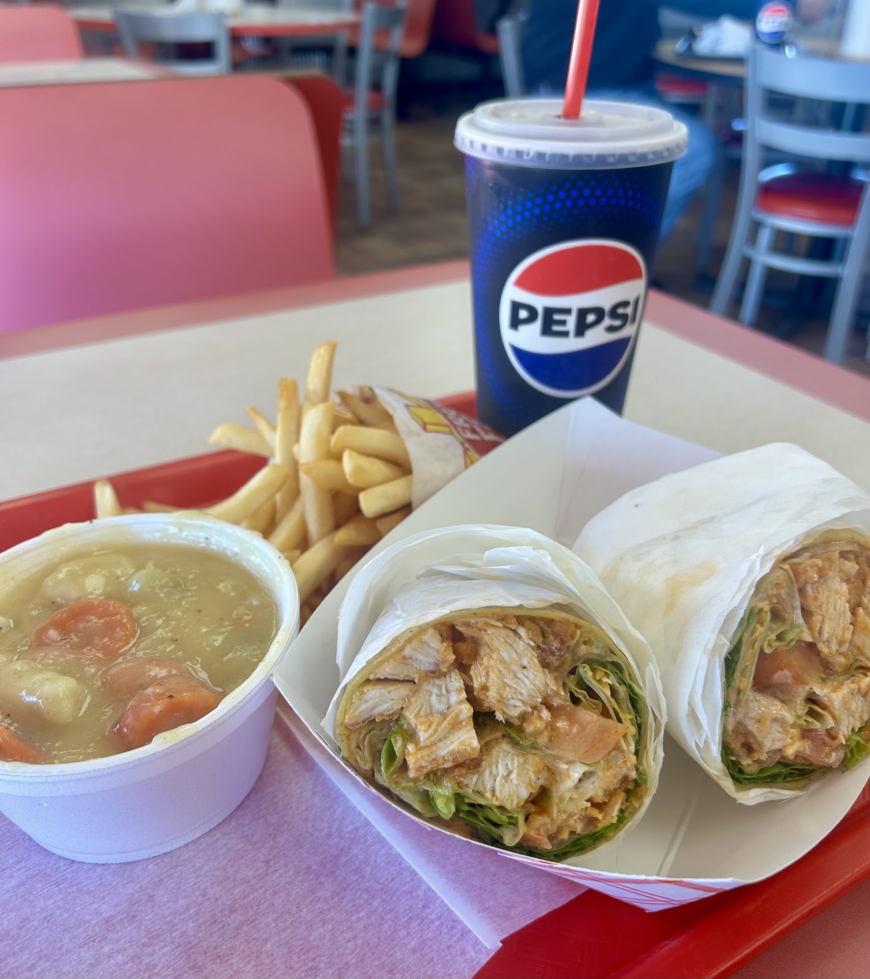 Read moreI got the chicken and dumpling soup, I thought it was pretty good! It had a good ratio of chicken, dumplings & veggies. I also ordered a buffalo chicken wrap, which was OK but a little too messy for me. I probably would not order that again, but it did taste good… the chicken was breaded and a good size, I would’ve preferred it with a blue cheese crumble instead of blue cheese dressing, which I think would’ve made it less messy because it started to fall apart towards the end. They had so many wrap and sandwich options, I will definitely be trying some other ones. The real star of the show were the french fries, which were so crispy, I would come back just for those for those alone!! They also 12 different options for fountain drinks and definitely got some bonus points for having Dr Pepper.