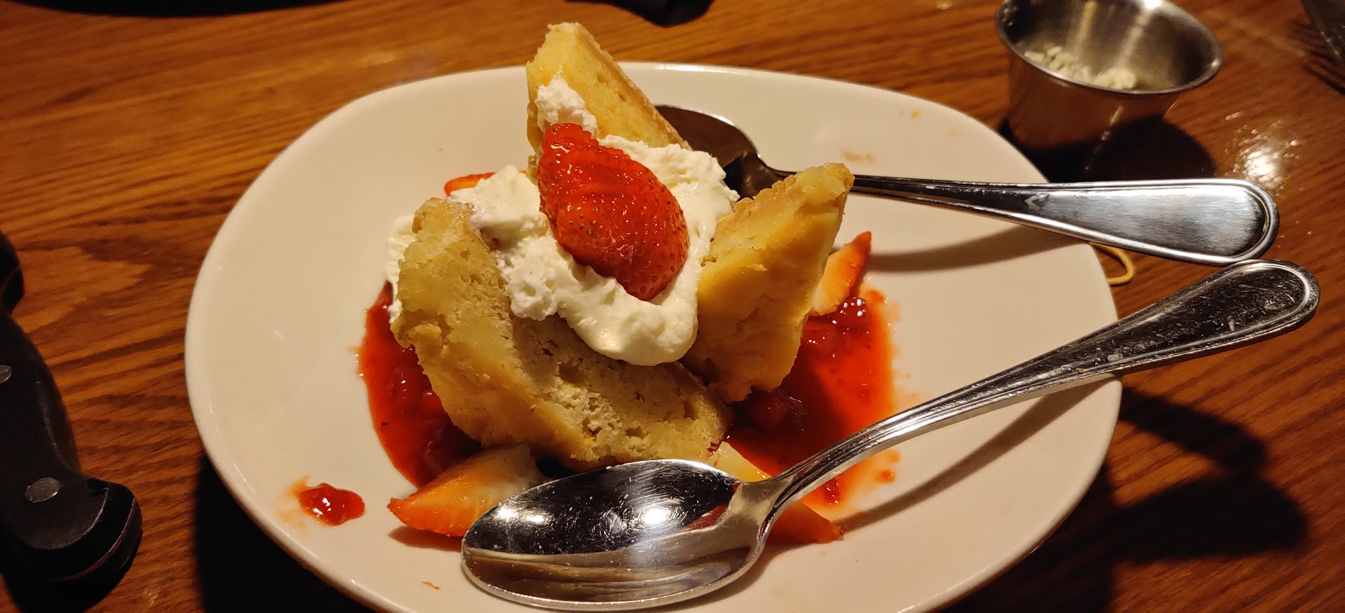 Read moreI am just going to start off by saying if you read this and reply you are an idiot. My second statement is I do not understand the level of subversion that is needed to eat here. There are so many small, non-chain places that have much better and cheaper food 20 minutes away. I feel the only reason they get business is half of the people HAVE to come here because they accidently received a gift card from someone (out of spite). We came to eat here because we had a $50 gift card, the only reason, and we had it for 10 years or so but just wanted to dump it. I ordered the BLOOMIN burger, Wife got a salad in which she enjoyed which was good for a vegan, and the kid ordered the chicken sandwich which he seemed to enjoy. The sandwiches were $13 which is silly, but whatever. The BLOOMIN burger was just boring. It says it comes with spicy pickles but they tasted more like cucumbers with vinegar. The fries were over seasoned yet mediocre. Son ate his chicken sandwich, not sure if it was good or not though, same boring fries. I did not finish the burger which I do not enjoy not finishing food but it was like eating corporate America. We then unfortunately had money left over on the the gift card so we ordered desserts. Butter cake with A SINGLE Strawberry and sauce, and the tim tam cake. They took quite a while to come out and being that the dishes they were on were cold, they are clearly made ahead of time and sitting in the fridge, as you can tell by the dried out edges on the butter cake. The butter cake tasted like sugar and butter which I guess if that is what you are into, good for you. The whipped cream was ok and the single strawberry (not including the ones in the sauce) was good. So, there is that. Kid ate the Tim Tam cake but I would REALLY REALLY suggest looking at the nutritional menu before eating at this place. Bloomin onion 1620 calories, Bloomin burger 1140, Tim tam cake 1500 calories COME ON!. 130 GRAMS OF SUGAR, that is a D battery, or close to the weigh of a baseball of sugar. You wouldn't eat that. Literal quarter pound of sugar. I find this place amusing.