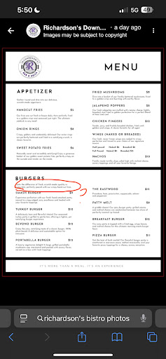 Friday evening I decided to order the exact same thing and order two burgers to take out for dinner after waiting 25 minutes in the restaurant (despite placing my order in advance) I walk out and get back to my car with the two burgers for takeout and I realize that neither one has fries included. I called the restaurant as I was already heading out of town to let them know that they didnāt give me the fries and I would just like a refund for the cost of the fries. Their menu clearly states that nine dollar burgers come with fries that was how I interpreted it and Iām sure many other people too. The restaurant owner eventually gets on the phone and tells me no the burgers do not come with fries despite me ordering the exact same online listing yesterday and receiving fries and that that was a Thursday only special Despite that not being indicated anywhere on their menu or ordering website. Owner laughed and said he would refund the cost of one fry to me only.