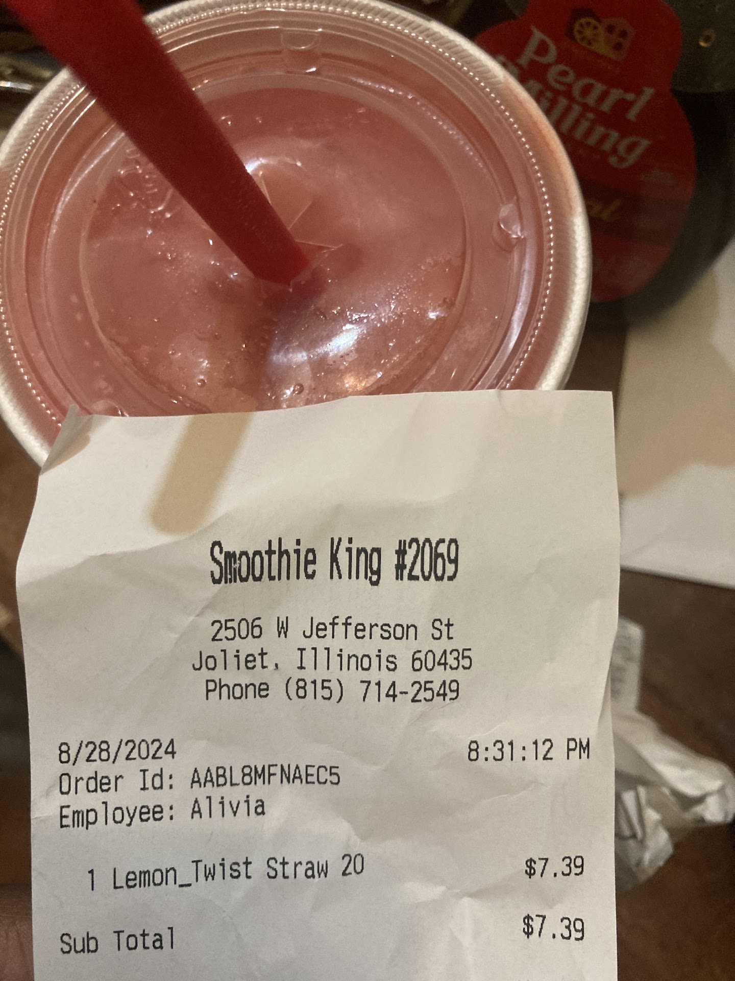 Ā Ā Ā Read moreItās 8:30 at night and at the drive through she says hello and I say āhello, can I have a small lemon strawberry twist and a coca haze with extra granolaā the employee Alicia says ā sorry we donāt have that or anything with berrysā so now Iām confused and I say ā you donāt have what ?ā An the respond ā no, sorry I said a small lemon strawberry twist not berries ā and then she asks what size ( keep in mind I work past 8 in food service too but that doesnāt mean Iām giving Attitude with a rude tone towards the customer does it ? Even if Iām tired) so I say a small and I ask if thereās any bowls for the rest of the night and she says no and tells us to pull up. The only good thing was the drink , she was rude and gave a bad customer experience I donāt care what type of personal problems your having keep your personal and work life seperate. For it being my first time ordering at smoothie king having a bad employee...
