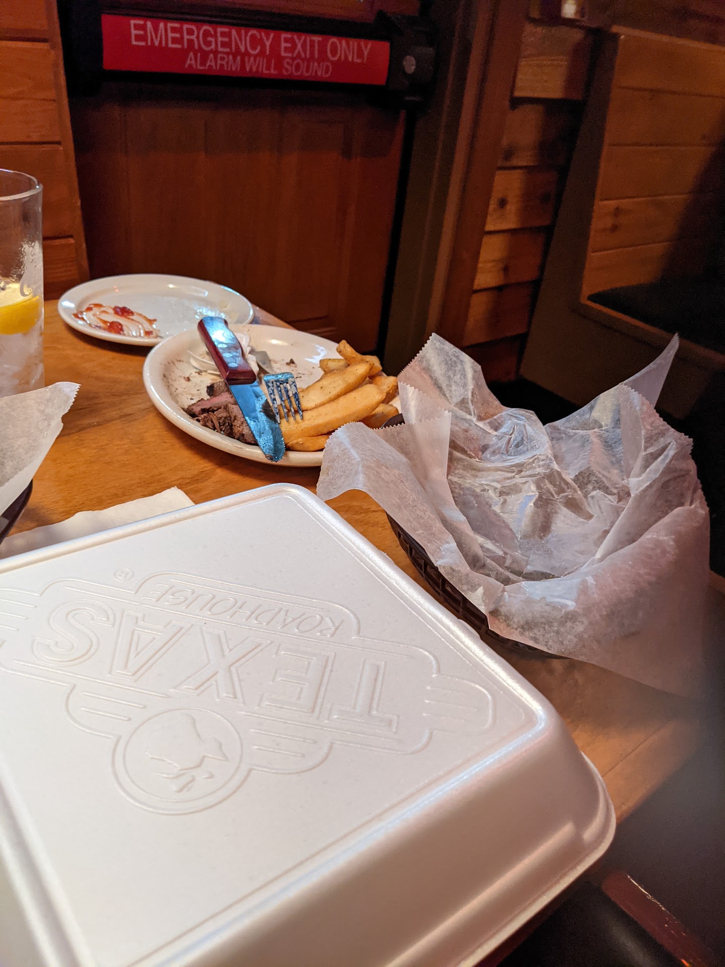This is a long review and I still am unable to express just how awful our experience was. My wife and I ate here September 19th. It was to celebrate my new job. Worst experience at a Texas Roadhouse ever. Our server's name was, I believe, Hailey, and she started out very well. However once we had ordered, something we settled for because she told us they did have Prime Rib cooked med-rare, but after 15min we were told they only had medium. We thought since it's Prime Rib it will be just as good. We thought wrong. It was awful. We never got a chance to tell Hailey we were unhappy with it because she basically ignored us once we were served. After 20min she walked by our table and saw that we still had quite a lot of food left on our plates. She asked if we needed boxes. We said yes. She ran and got us two boxes through them on the table, through our receipt on the table said. Here's your receipt. You can pay there or you can pay cash. She ran off again without asking why we had so much food left. I was so disappointed and my wife was just heartbroken that my celebration dinner turned out to be ruined. I don't blame Texas Roadhouse for the food. I blame Haley for the service. She saw that I was unhappy with my food because she kept looking at me from other points in the restaurant but she would never walk over and ask me what was wrong. I myself was a server for 30 plus years and I was just appalled by this level of service. It's saddens me to give Texas Roadhouse a bad review because this is one of my favorite places to eat. However, after the service that we received, we will never be back to this store. If we want prime rib or steak we will drive as far as we need to go to get good food before we will ever step foot in this Texas...