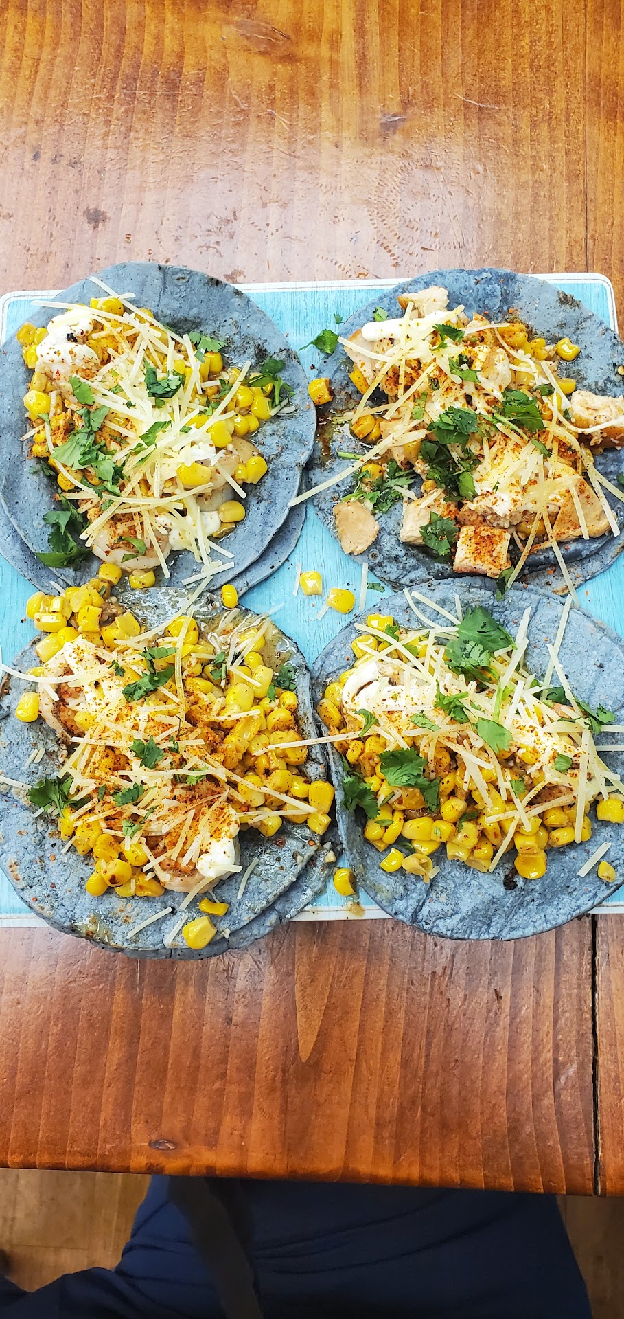 We had the elotes chicken rice bowl, they offered blue corn tacos (hence The Blue Taco) our son had the taco version.