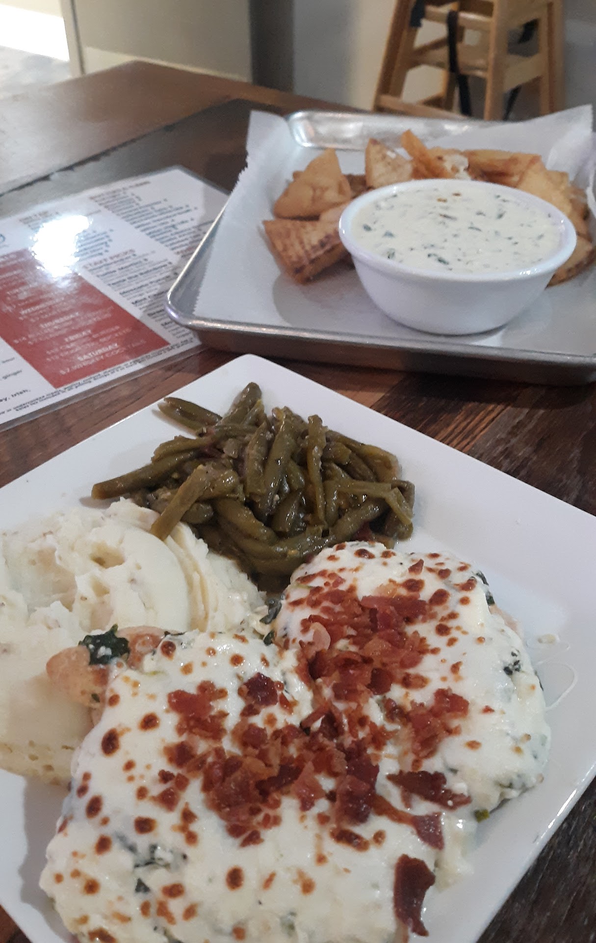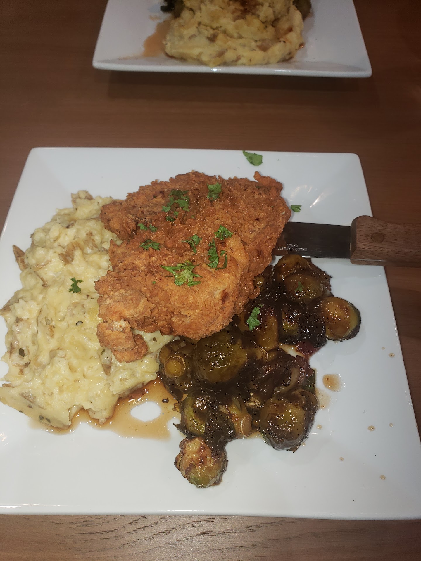 Food. Was very good and at the price I would say it was a great value. I had the fried porkchop that came with garlic mashed potatoes and brussel sprouts. The pork chop was was battered and fried and was excellent. Nice and moist. The potatoes were excellent with just enough garlic and had bits of bacon. They were right just right. Brussel sprouts were incredible.Brussel sprouts had a whiskey glaze that was sweet and smoky and perfect. I actually ordered some glaze on the side and drizzled that on my pork chop!