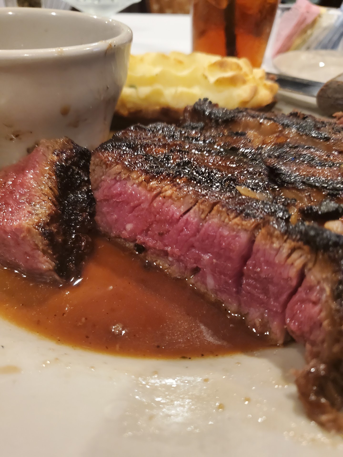 Read moreI ate dinner here for Valentine's Day. The atmosphere is a typical mid-to-high end steakhouse atmosphere. There was a live musician singing and playing keyboard covers of love songs. My date and I both ordered medium-rare filets ($30). The steaks were cooked medium-rare and seasoned nicely. The issue was with the steak itself. The filets were not of a quality that I have received from other similarly priced steakhouses. The filet was thin and the meat was not dense like a normal filet. It was as if the integrity of the meat had been compromised during the physical tenderizing process (who knew that you had to physically tenderize a tenderloin?) and the meat was a mushy texture. The asparagus ($4 up-charge for a 1 person side of asparagus) was undercooked. The ends were very stringy and chewy. They probably should have trimmed more of the end off, or cooked it longer. My baked sweet potato had no issues. My date ordered her filet with a bleu cheese topping which was well executed. Her side of goat cheese smashed potatoes ($4 up-charge) was also very good. Her jasmine rice side was dry and under-seasoned though.