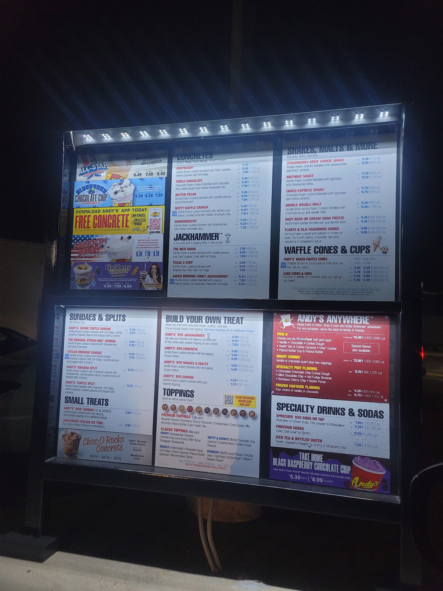 Protip: everything on the menu is super expensive for what you're getting, but I recently found out a two scoop cone is only $2, so go figure. Anyway, besides Andy's being expensive, the staff is typically not very friendly, as they are hasty and, basicallt, you're not worth their time. I understand when it's extraordinarily busy if you forget some manners, but when it's not, there's no excuse. The frozen treats are good, but the staff could use some extra training on...