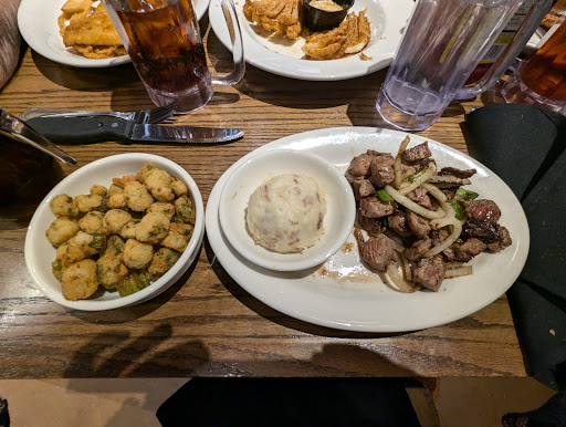 Read moreThe service here was relatively good. The overall experience was not. We were passing through and were looking for a steakhouse and gave this one a try. The flavor of the ribeye was good but my medium well was a little undercooked. My friend ordered a filet mignon, medium, and after a couple of cuts into it there was blood all over the plate. That one was definitely undercooked. When they served the loaded potato soup, I immediately knew something wasn't right. It was the most white potato soup I've ever seen, and the only reason they can call it loaded is because of the shredded cheese and bacon bits they sprinkle on top. I believe they must be using canned potatoes and heating them up and calling it potato soup. I enjoy loaded potato soup when it is on the menu and I have had excellent ones at many restaurants, but this is by far the worst I've ever had. They really need to take it off the menu here, because it is an embarrassment. The macaroni and cheese has an appealing appearance, but it is nearly tasteless. I doubt it has any actual cheese in it, and more than likely they're dumping this out of a plastic bag. It seems about the only thing they attempt to "cook" here is the meat, and that needs perfecting. Several things here they just seem to get from their supplier and heat it up and serve it. And why serve imitation butter (margarine) with the rolls? Will it break the bank to get a pat of actual butter? Gotta do better than that....