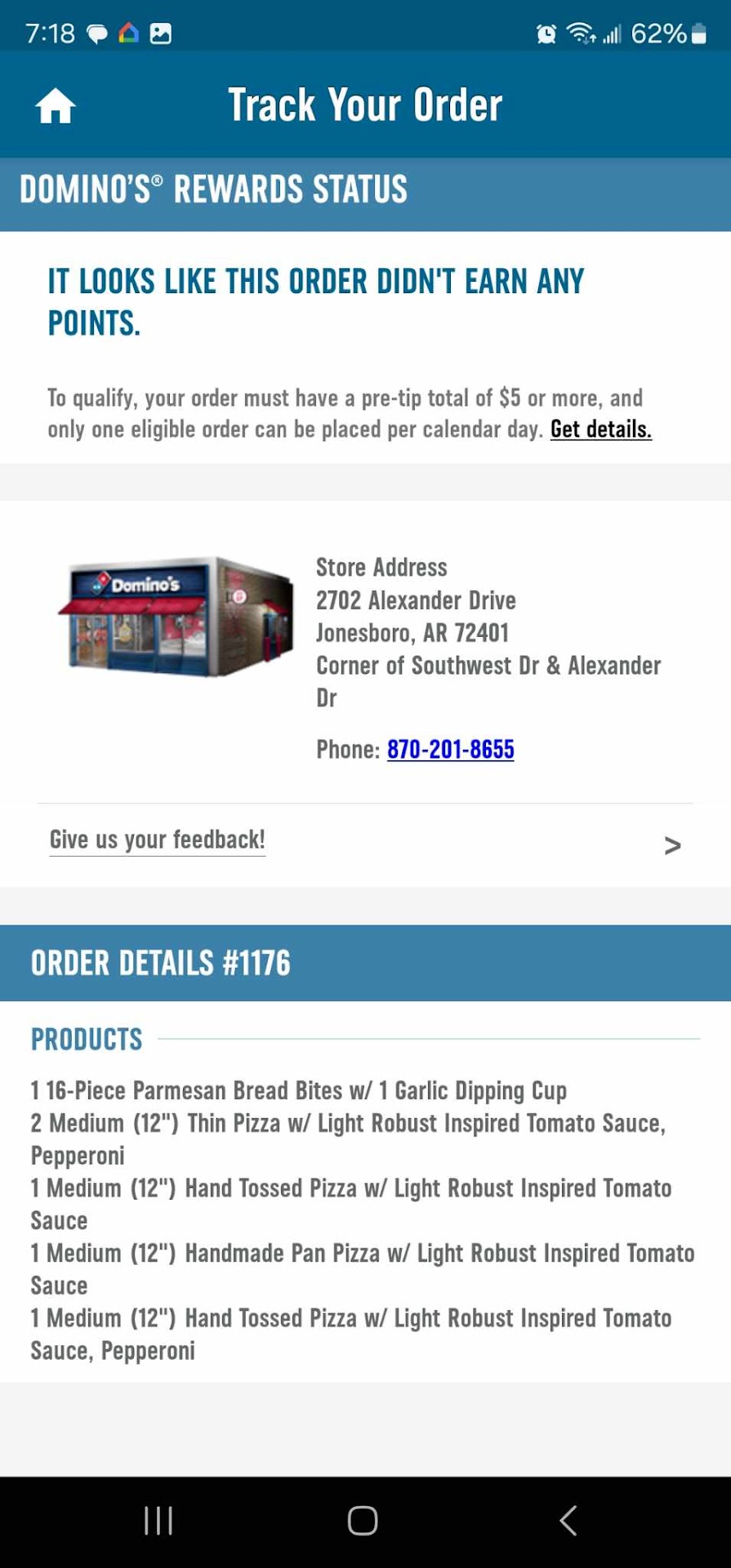 If anyone from Dominos sees this, order # was 1176, placed a call about it at around 7:15pm. We also tipped pretty good as well. As a side note, I love that Dominos has a policy on their box that says "Our guarantee that we will make it right". Yeah, just not at this location. I'm also about a 2 minute drive from there, not like it's across town. Spent around $55 for this order, which I know isn't huge, but it's enough.