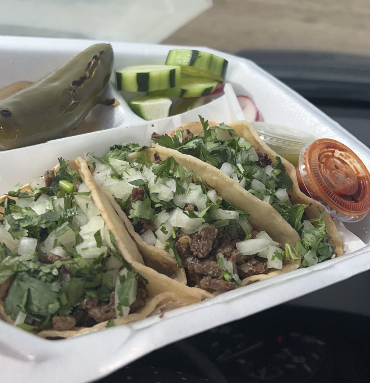 The quesabirria tacos at El Sazón de mi Jacal are spot on — delicious. Prices are typical for tacos around here, nothing out of the ordinary. I placed my order and was given a buzzer, which let me wait in the comfort of my truck with the A/C on. They do have about four picnic tables outside if you want to eat there.