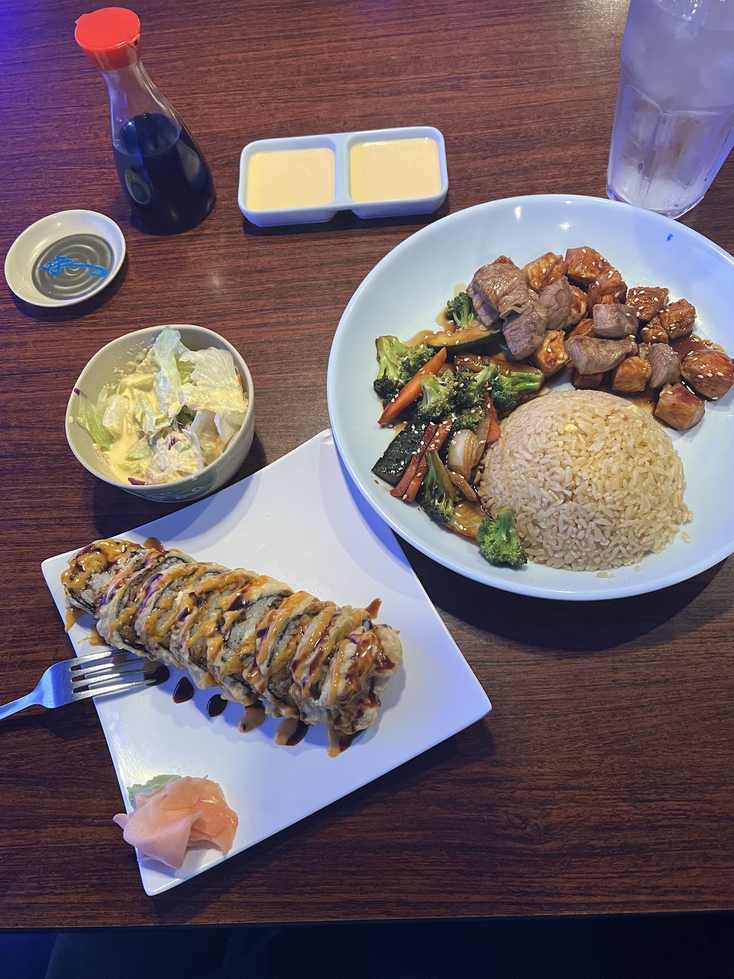Read moreTo rate this, I would rate it a 4 out of 5, however on a 10 scale, I would rate it a 7 out of 10. When I first walked in it, the interior decor was modern and beautiful. Once I walked in, I told the waiter I was dinning in and gathered the menu. I did ask if I can sit by the window, however they told me that section is in available, which I understand. Before I sat down to look through the menu, I first went to the restroom. This is where I rate the restaurant a 7 out of 10. The mens restroom was disgusting. Trash is scattered all over the floor and the trash can is severely overflowing. It looked like a bomb went off and scattered paper towels everywhere and I almost forgot I was in a mid price restaurant. I walked back to my seat and asked the waitress what did she recommend for sushi, she offered, The Hiro Mini Roll, I took her offer and order a hibachi chicken and steak, with the steak medium rare. The food was delicious. The sushi was not spicy, unless you can not handle spicy Mayo, and the hibachi was amazing, one critique I will add is about the steak, I asked for mid-rare, however it was medium to medium well, however I do not mind that much. Overall, the food and customer service is golden, the bathrooms need work...