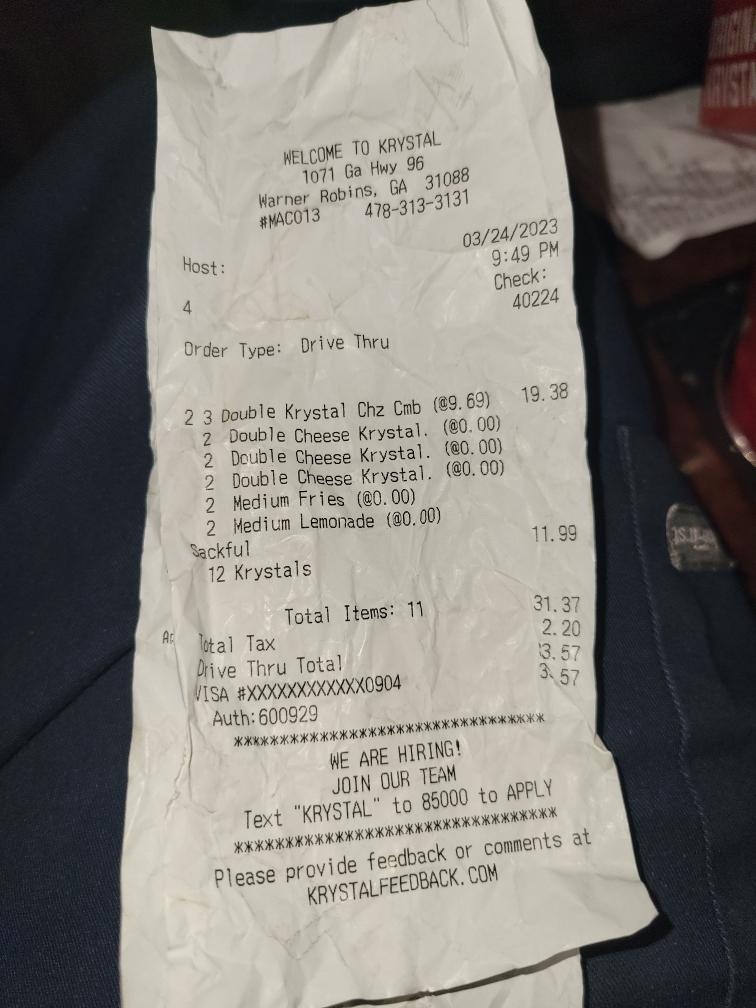 Read moreAbsolutely rated the worst customer service I'll ever received. We ordered at the drive thru 2 double combos and a 12 sack. Only received the 2 double combos so we turned right back to received the sack. She viewed our receipt, we asked could they be hot due to double combo burgers being cold. She returned to the window with the hot 12 sack and insist that they would re-cook the 6 doubles. Awesome we thought, nothing better than hot steamed krystals right? Gave the employee back the combos with the exception of 1 double burger and both drinks... well she comes back to the window with only 3 double krystals from one of the combos( with no fries) and says she said she can only give you 3 double krystals back. Huh? Why? So the I guess Manager comes and say you only gave 3 back. No ma'am I gave back 5 krystals and 2 fries. She says have a good night and shuts the window and refuses to come back to the window to rectify the issue. My friend wanted to just take the loss but I respectfully refuse to accept the harsh treatment and leave with the missing order. Door was locked and they refuse to answer the window, door, or phone. So I called the police and wanted to make a complaint with names involved. Police went to window and spoke with the manager and she insisted she would give a refund if we agreed to never come to that Krystals again. Please tell me what did we do wrong??? This was very disappointing and I didn't have to be asked to never return because Krystals will never be viewed the same after this. Terrible customer service loses...