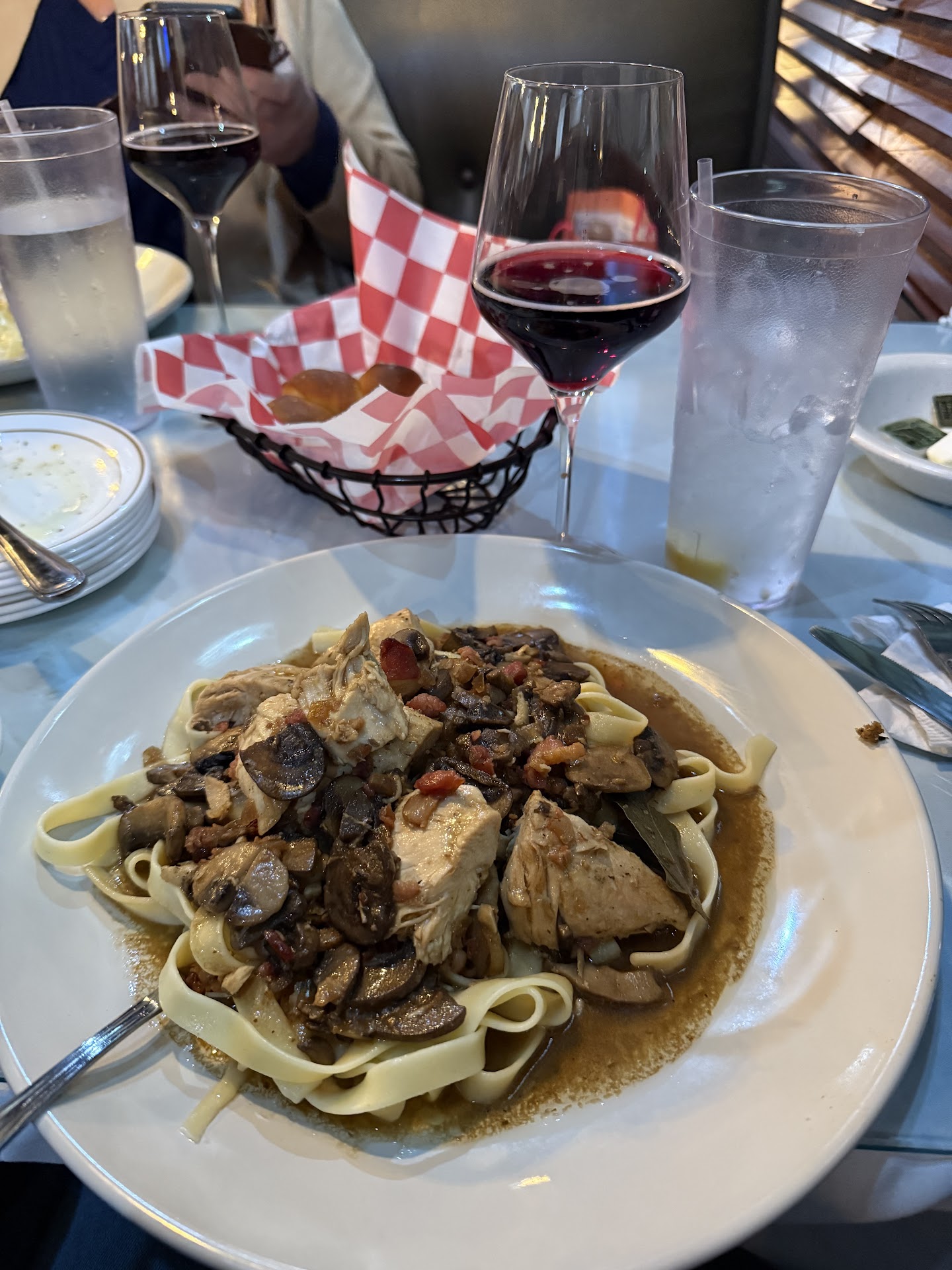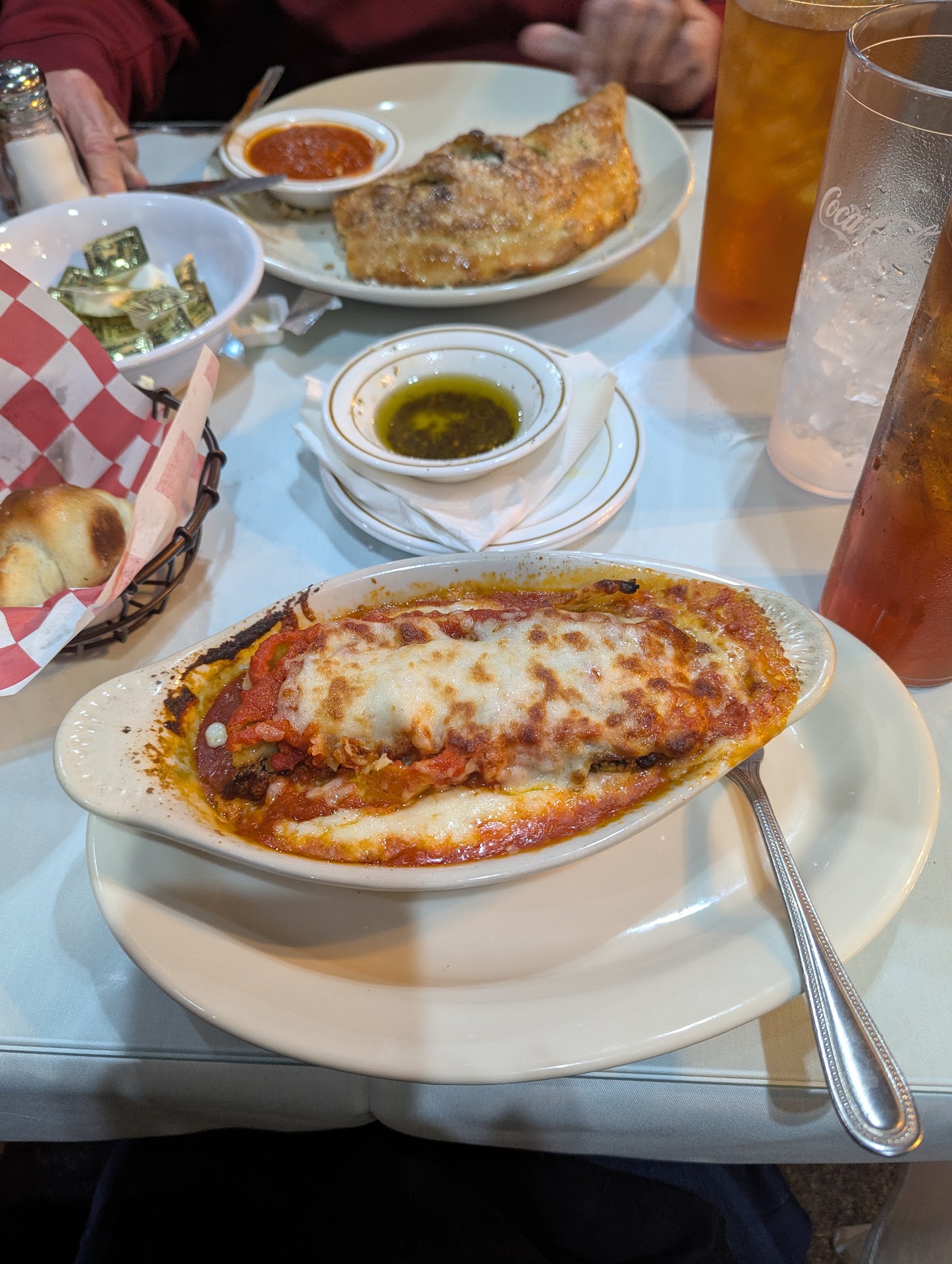 We received the complementary bread and oil, which was tasty. We started with the toasted ravioli appetizer and ordered extra marinara sauce to share. The ravioli was delicious and the marinara sauce was a nice extra for the remaining bread. For our meal, we each ordered a different pasta dish that included a side salad. We received the salads almost immediately with a combination of the House and Caesar. The salads were just okay, as they were mostly lettuce with minimal toppings. The salad dressing was served on the side and was just the right amount. The entrees arrived very soon after. They were great and we each had plenty of leftovers to take home. I personally recommend the Rigatoni Alla Carbonara. However, it is listed on the menu as grilled chicken. The chicken seemed to be boiled but still good. The sauce and bacon were the stars of the dish and made it a standout. The other dishes ordered were The Works, Chicken Parmigiana, and the Shrimp Scampi. The Works received the highest praise. Unfortunately none of us took photos of any of the food.