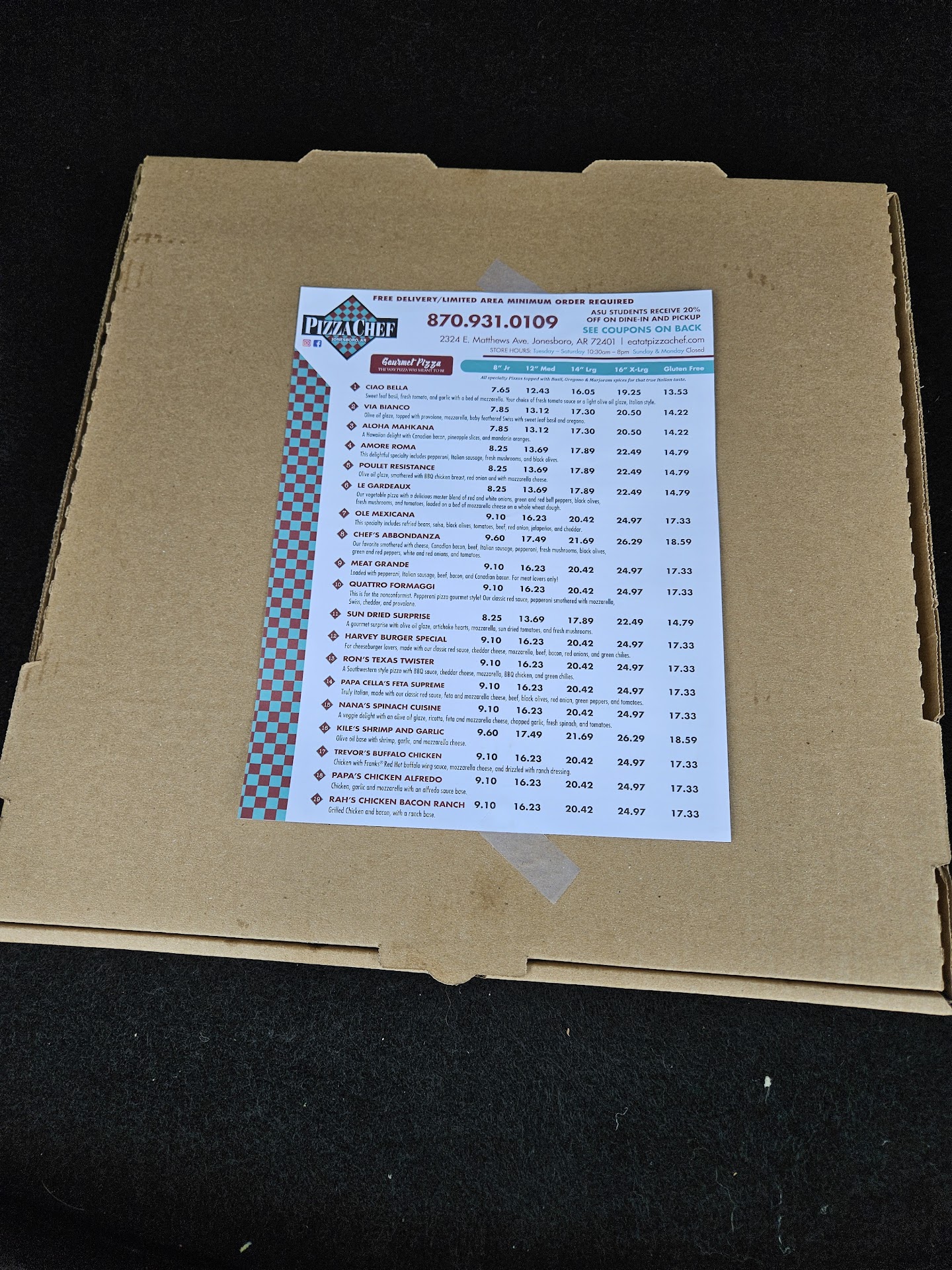 Read morePizza Chef is not vogue, certainly not flashy or gimmicky. This place just makes impeccable food and has for as long I can remember. The crust is chewy, but not too thick. The toppings are abundant. We got 4 junior specialty pizzas tonight to share and each one was a delight. A mushroom/artichoke one that holds its own against any meat pizza, a cheeseburger one that makes you think you're eating a cheeseburger, a spicy Buffalo chicken one, and a pepperoni that somehow leaves you talking about the cheese. All thoughtfully created and...