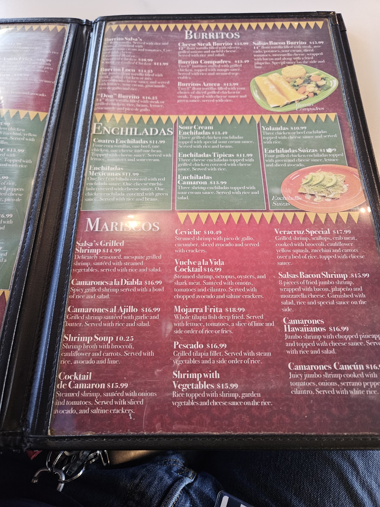 I think many may forget about Salsa's Grill. We live closer to Kandella and tend to eat there more often. So we've rediscovered this place as well. Haven't eaten there in years till April 2021. Went on a Saturday night @ 7 and was worried because there were only 8 customers in the whole place (it soon began to fill so we must have arrived at the right time 😁). Food is on par with most all similar restaurants in town as far as names, portions, and price. See pic of their Avocado Diet. Same name, look, and taste as Kandella's. My family and I have eaten there at least five times in the last month. Including the evening of Cinco de Mayo! Every time has been a good experience. Food is fast and plentiful. Drinks never go empty for long, if at all. I'm a big boy that likes to eat and tend to get the "Big Burrito" everywhere I go. Their Don Burrito (aka Burrito Oso and Big Burrito at other places) IS HUGE!!! This big boy got three (3) meals out of it! 😊. This place does not have a bar like Kandella's but definitely worth it for the food if that's what you are after. Parking lot is kinda small and will appear to be packed but it just seems that way. Even on Cinco de Mayo, we parked on the side in the back. Walked in and there were plenty of tables available without being right on top of other customers. Give...