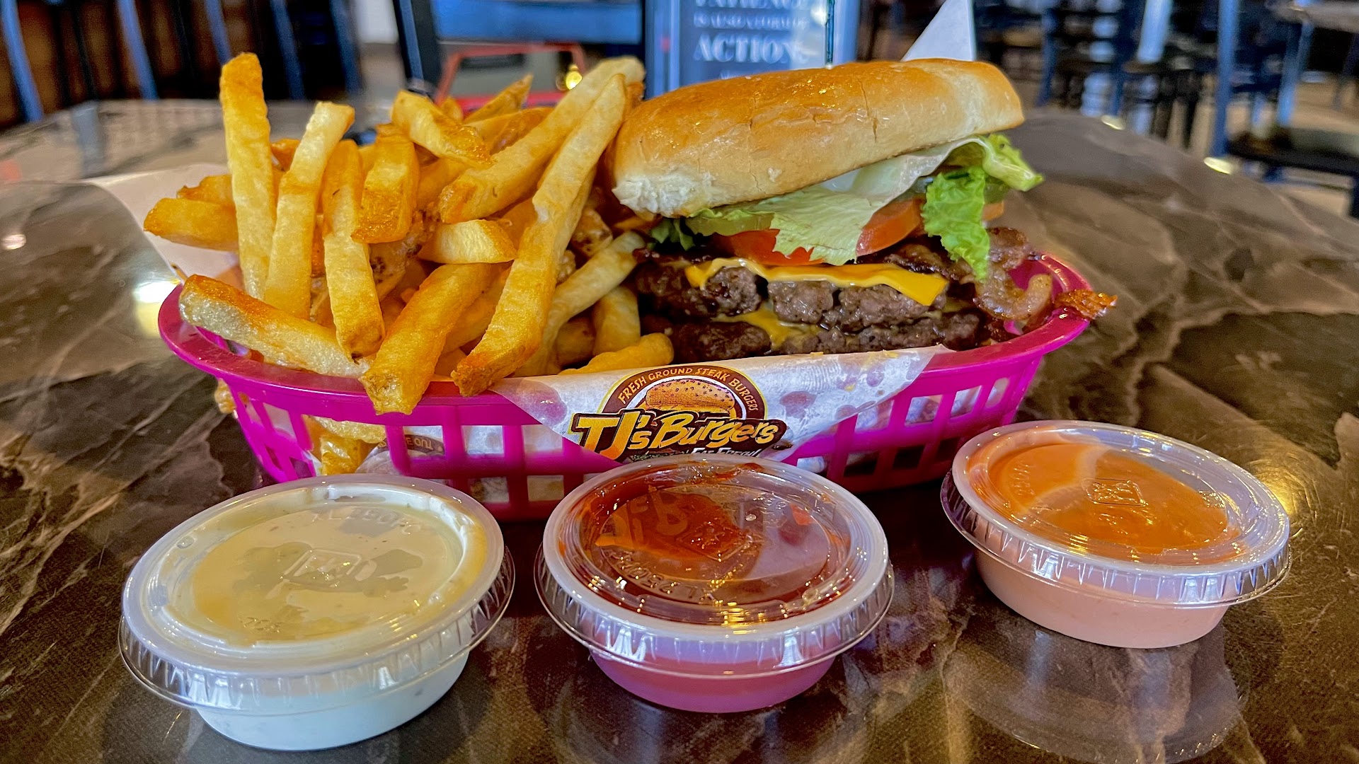 Fresh ground beef ground in house, and fresh milkshakes made to order instead of frozen patties and soft serve with other sweets added along with in house hand cut frys definetly sets the tone for a better quality meal when it comes to your everyday run of the mill fast food burgers ,frys and milkshakes here. The frys come in three styles: Cajun,Seasoned or Classic. A fresh take on the common favorite meal that we are all accustomed to when visiting a regular fast food chain. Your perspective of the everyday burger and fry joint will be changed once you try this place. The fries are wonderful. The milkshakes will definetly bring "all the boys to the yard"because they are much better than others but they have to charge... If your looking for a great burger ,fry and shake this is the place to be. The staff was welcoming and very helpful while trying to navigate a new menu. The restaurant was clean and that's always a good thing when dining out. Whether you order a la carte or one of the combos here the hand cut frys and the fresh ground meat along with fresh made to order milkshakes will definetly bring a smile to your face. The price may seem a little on the high side for a burger and fry but when you realize the preparation and quality of the products it all makes it worthwhile. A great burger made with high quality ingredients including the option to have extra add ons like "bacon onion marmalade" ,provolone or grilled mushrooms,made to order milkshakes and hand cut frys then this is a place to go. I highly recommend this place for an uncommon meal even if you think burgers and fry are common you will feel differently about this after trying TJ's. Tell them McDonalds sent you because, if they knew the difference in the quality of food it would only be true.Hands down a great place for a new take on a meal you've had more times than you can recall. TJ's is a burger joint on a different...