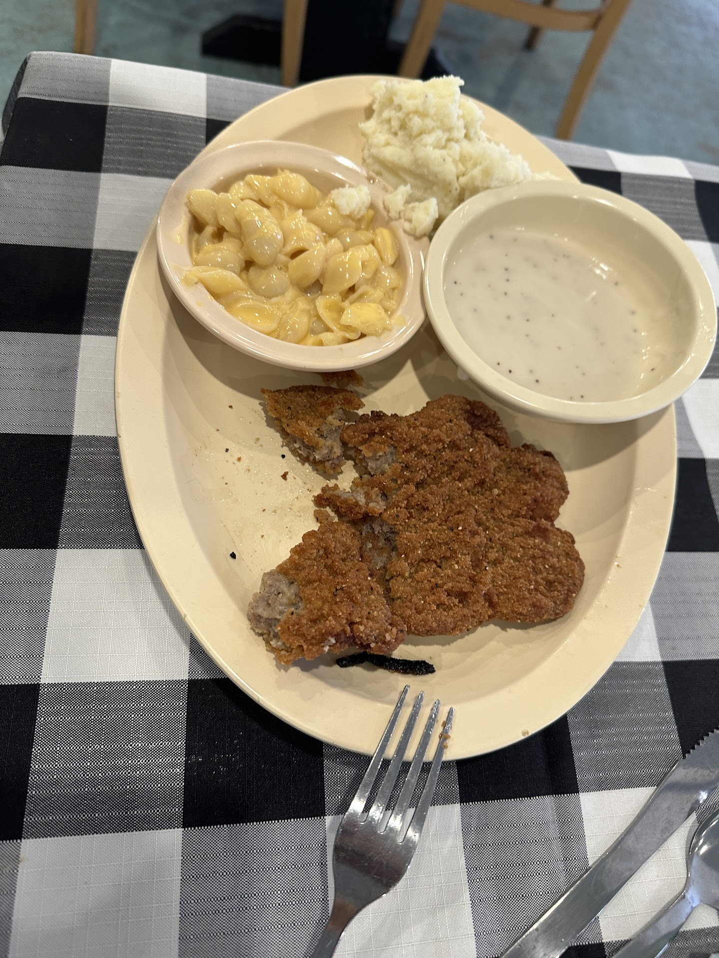 Read moreMan, I wanted this place to be good! I love seeing small family owed restaurants succeed. Sadly, it wasn't a good experience even though it seemed like they were trying. My family of 5 visited last night (Friday.) I got the "Chicken dinner" which was supposed to be a chicken breast with mushrooms, bacon and pepper jack cheese. When it came out it was just the chicken and when I mentioned it to my server she took it and brought it back (in about two minutes) with two pieces of chewy bacon and some generic 3-cheese mix that had obviously been microwaved and no mushrooms. The chicken seemed like a precooked piece and when it was heated they way overcooked it, it was very dry and tasteless. The fries were just bulk crinkle cut and not very good, but the cornbread salad was actually very good. My wife got the hamburger steak and said it was dry but the mashed potatoes were decent. The kids got chicken tenders and a porkchop. The chicken tenders were decent but the mac and cheese was cold which the server reheated for them. The porkchop was again overcooked and dry.