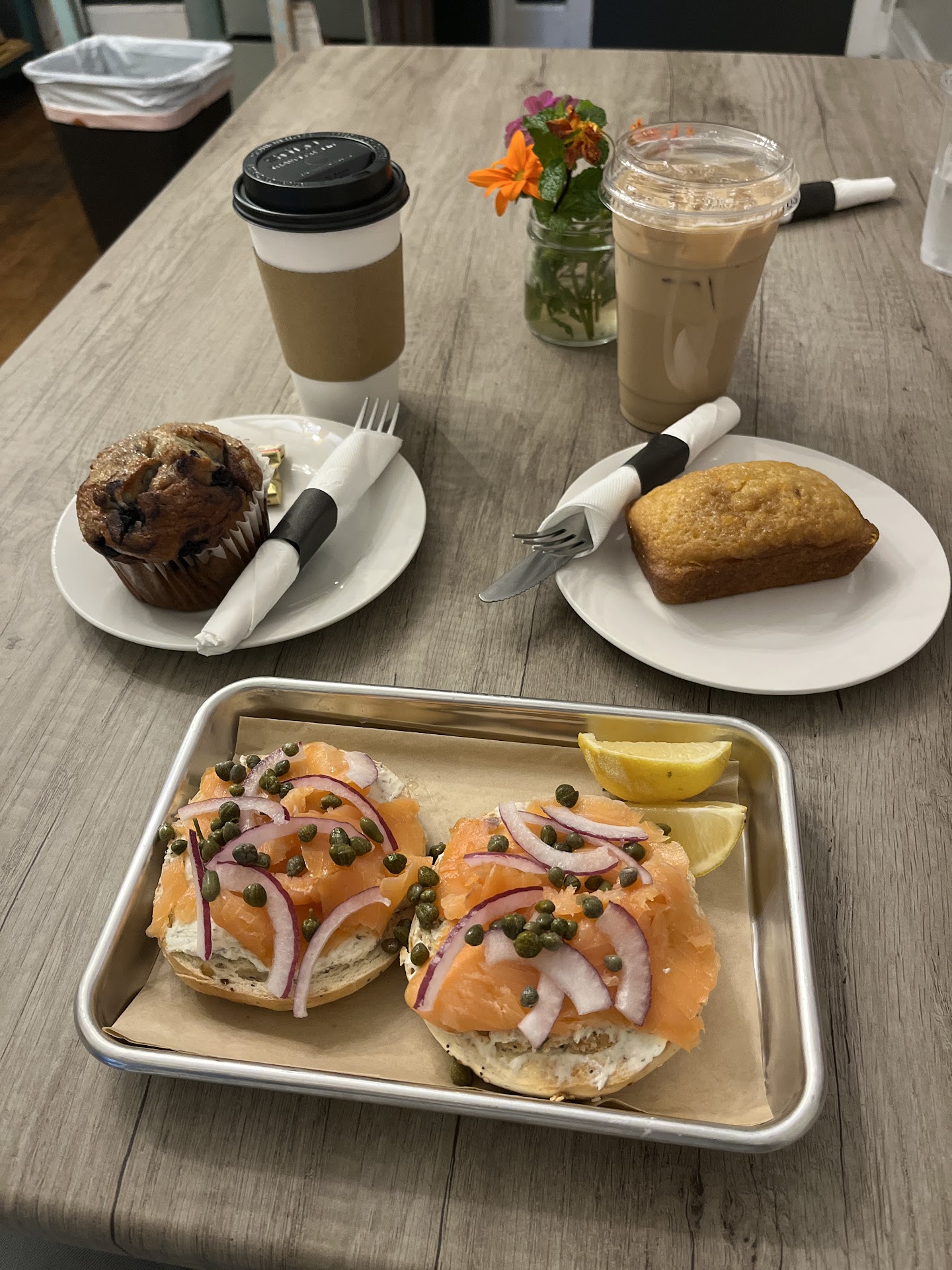 An October Saturday and what better place to have our little brunch of Chai tea, Flying Lotus (Matcha tea etc), cranberry scone, and my most favorite--a delicious Lox Bagel, put together with craft and love. Starts with a very soft warm everything bagel, cream cheese, lox, dill, and capers. We ask for the capers to be placed underneath the lox, although aesthetically nicer on top. Can't emphasize enough how we ❤️ this local coffee shop plus more. Friendliness and hometown feel. Support your local coffee shops. We travel a lot and try to do so even on the road.