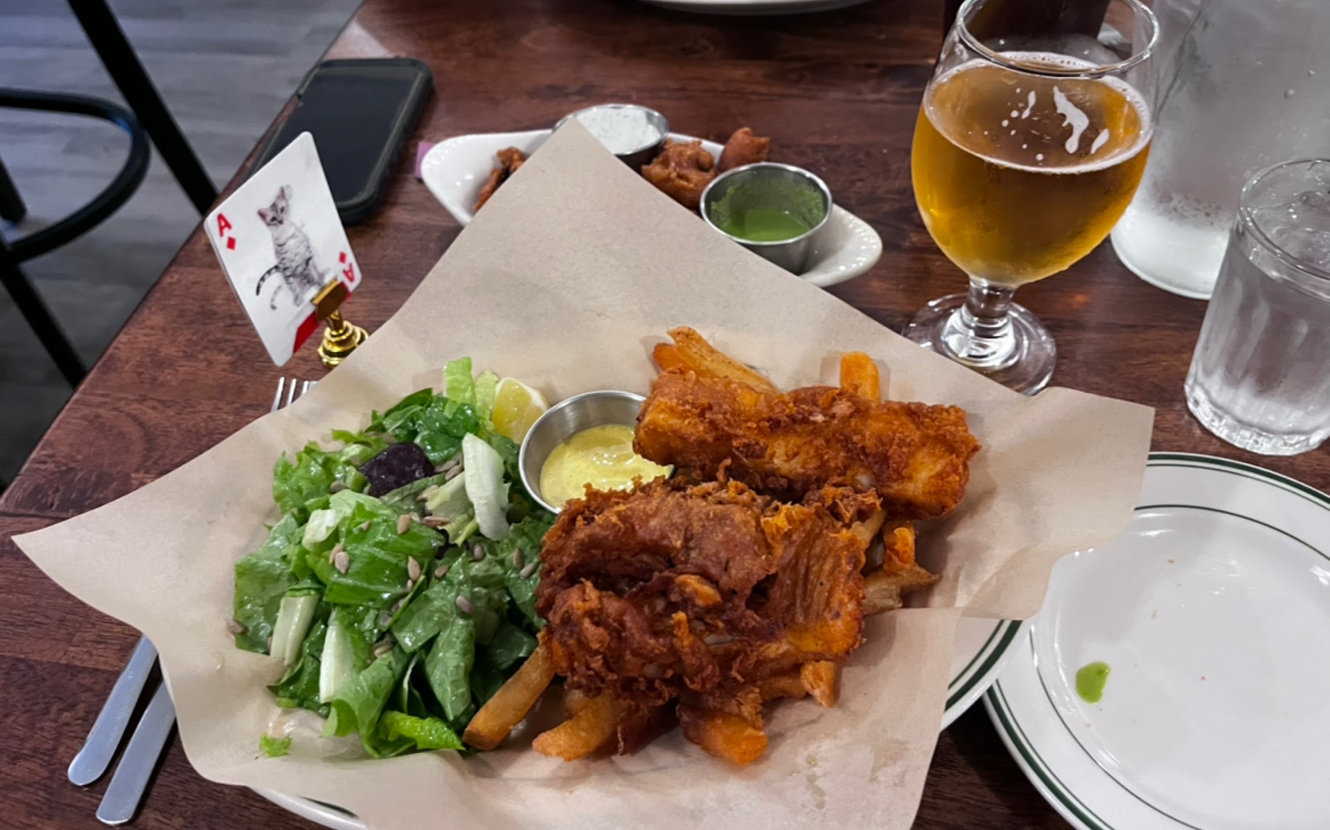 We stopped in for an early dinner after a Saturday matinee at the JRT. You place your order at the register and they bring it to your table. The four of us ordered vegetable fritters, deep fried mushrooms, fish & chips, Shepherd's Pie, and Bangers & Mash. I didn't care for the mushrooms, too much batter and a little overcooked. I liked the curry yogurt sauce but others didn't. The fritters were good. The diner gave the Shepherd's Pie an average 3 stars. The diner with Bangers & Mash also gave his dish an average 3 stars. I had fish & chips and thought they did a great job. The batter and serving size were good, and important to me both were served hot, crispy, and fresh from the fryer. The salad served along with it was a nice touch. The cashier and food runners were friendly and efficient. For my partner and I, the mushrooms, two fish & chips, a house red wine and a Guinness with a 20% tip totalled $65.18. I recommend you give it a try! Update 11/12/2025: Walked by over the weekend and saw a political flyer in the window from "No Kings" about supporting "immigrant families". I think it's poor judgement to put political signs at your business, especially woke BS in an area that's 70%...