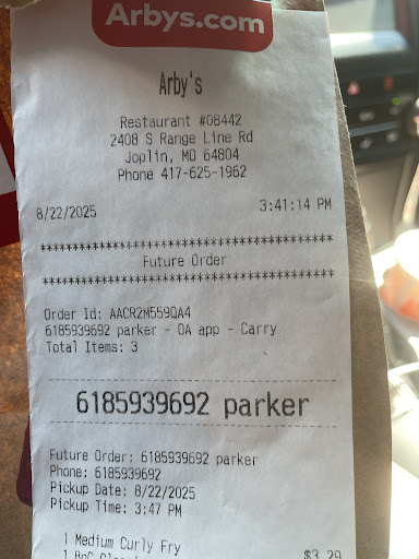 Arrived at 11 AM and it wasn't busy with lunch crowd yet. The gentleman that took my order along with my wife and daughter, was very courteous. Repeated the orders back to us to make certain he didn't miss anything and to see if something else needed added to original order. Even though my wife didn't order a beverage, this gentleman gave her a medium cup anyway so she could get some water. Thank you for this simple act! While waiting a quick restroom break was needed for all. They were spotless and well cleaned. The eating area was also well cleaned and well stocked with necessary items. All orders were out expeditiously, correctly and under 10 minutes. A "thank you" for our orders by the woman who called out are names. All was hot and tasty. As other customers came in it was the same courteous treatment for them as well. After eating, another thank you for coming as we were leaving. Must say, throughout my 45 years at eating a variety of fast food places, I can't ever recall being treated so nicely. This includes other Arby's as well in Missouri and Oklahoma. Thanks to Arby's for GREAT customer service and thanks to management and owner (if this particular Arby's is franchised out) for this staff during lunch. Next time we are in Joplin MO, and fast food is what we want, we will definitely be back! Thank...
