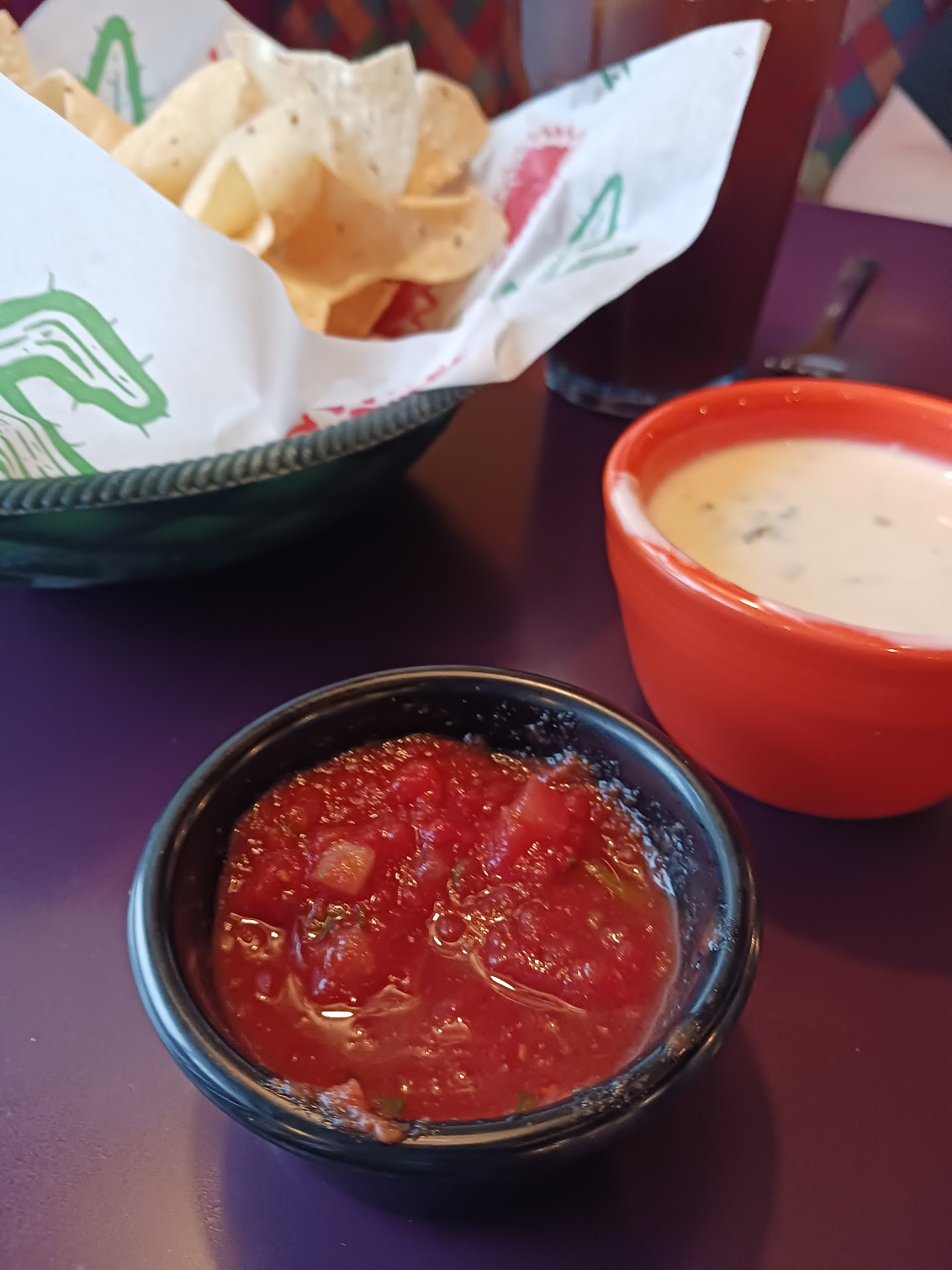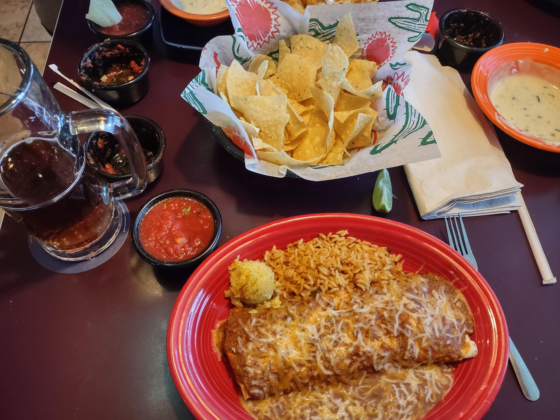 Read moreI loved the taste of the guacamole compared to other similar restaurants in the area.Salsa tasted like a glorified ketchup though,heavy on the ketchup taste. White cheese dip tasted good,although had a spinach like taste and green bits that also looked a lot like spinach. Weird. Never ordered a queso at a Mexican restaurant that had a spinach taste in it. I ordered a chicken chimichanga meal. It was ok. Tasted fine. My husband ordered mixed steak and chicken fajitas. He wasn't impressed in the least. He said it was very bland,no taste. From my view it was very very blaw looking,no color etc. It was mostly grilled onions and a tiny bit of green peppers . But what really surprised us was the steak and chicken didn't seem to be seasoned with fajita seasoning and just plopped on top of the onion mound with the tiny bit of green peppers. Literally a steak cut in slices played on the right and a chicken breast sliced and placed on the left top of the onion mound. Not mixed in. Not seasoned etc. Service was ok. The dining room was messy but we figured the time of evening we just missed the dinner rush. Our server was mainly busy cleaning tables nearby and as she passed asked if everything was OK or if we needed anything. My drink ice melted before I drank all my tea. I also finished my tea before my food and never was offered a refill. Maybe I should have said as she passed by cleaning tables that I needed a refill...although I shouldn't have to ask. She was very nice though. My husband and I both agreed if we ever came back we would definitely be ordering different items as we weren't impressed in the...