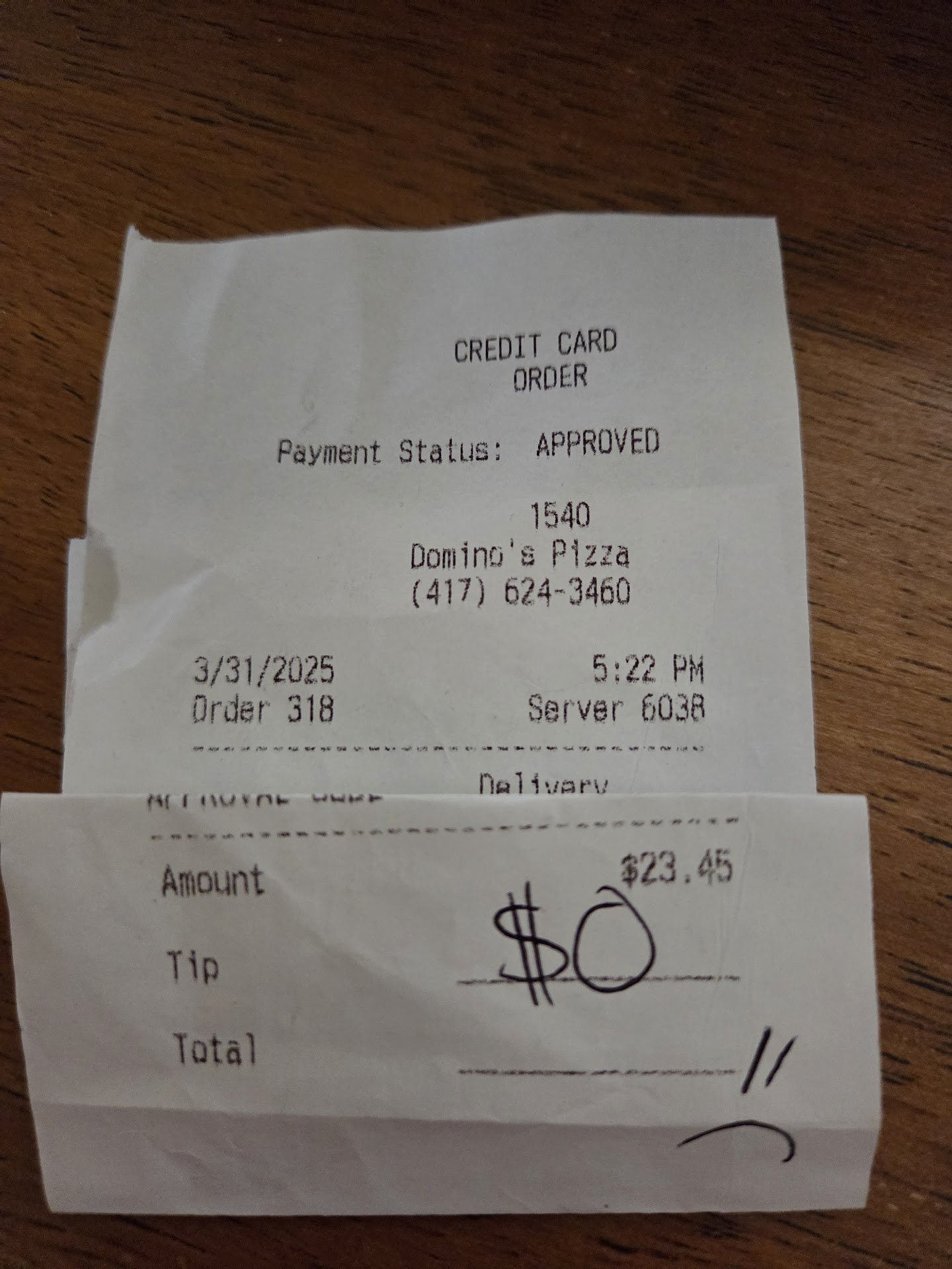 I went to pay for my order at the new location behind Popeyes on Rangeline, that was nearly $30 mind you, with a $50 bill, because why not? I had no idea Domino's had taken such a dumb stance on accepting LEGAL tender. I was informed by the person in the drive thru that they don't accept any bills over $20, and that I may have to go to a gas station to get change...