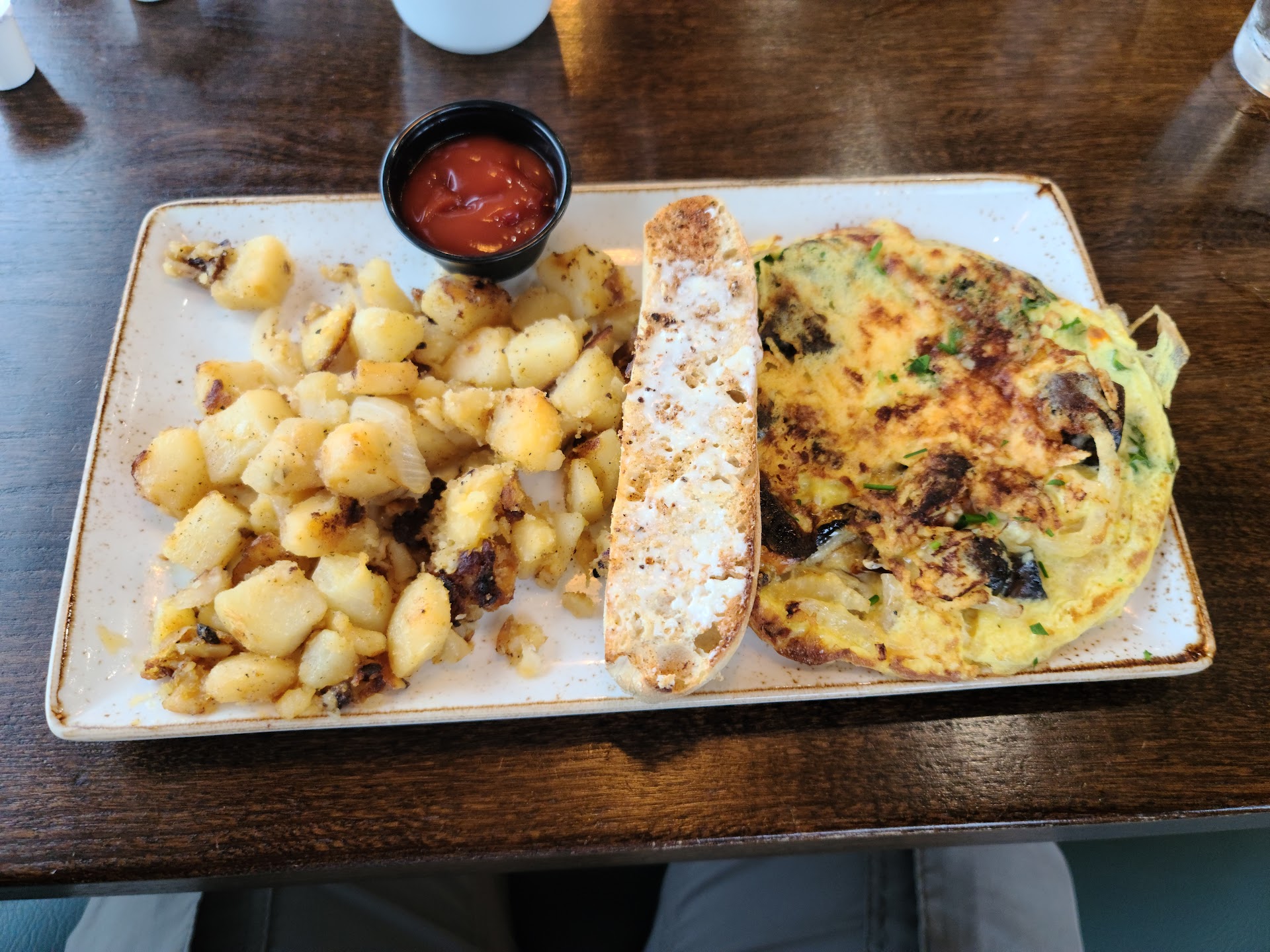 This feels like a restaurant desperately trying to define itself as sustainable food or farm to take but failing. The food is very expensive and they've done some of the familiar breakfast dishes with little twists that don't always make sense. Eggs Benedict is one of my favorite things for breakfast but theirs is served on ciabatta instead of the English muffin. Since I don't like ciabatta I just got a breakfast skillet with a side of Hollandaise.