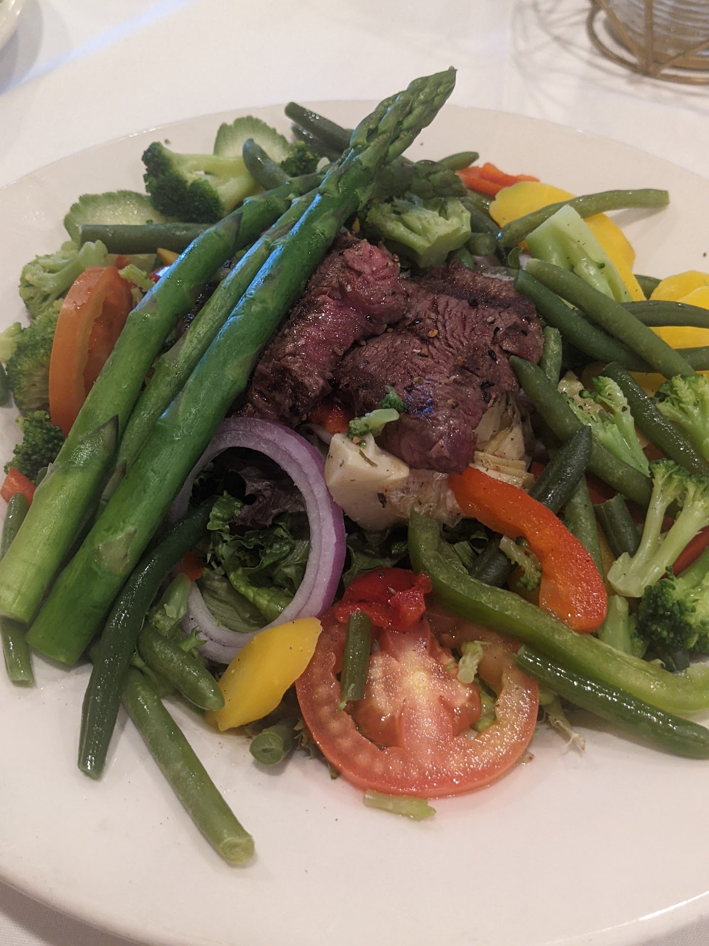 FOOD: I don’t even remember what my wife got (lol) but it was some Greek food. She really like it but it’s not something I would have enjoyed. It was different (reference the picture) and she likes new stuff. Me? I had a hamburger with bacon. I prob should have got a steak but was in the mood for a good hamburger. Whereas the burger was good, it was not over the top. It was near overdone. Maybe I should have upgraded to the Kobe burger. I’d try something different next time. Little disappointed here as I was figuring a great burger at an upscale restaurant.