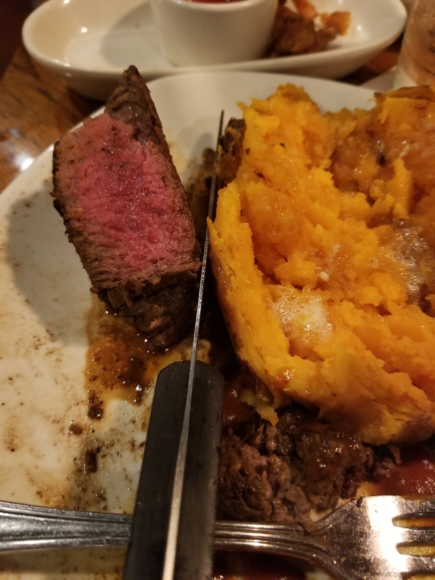 Read moreWe were on a short getaway trip staying at a nearby hotel and decided steak sounded good for dinner. When we arrived they took our phone number to text is when our table was ready. We literally stepped right outside the front door and got the text that our table was ready. We thought the whole process at that time was a little ridiculous as there were many open tables and almost no one waiting. We ordered a sirloin, well done and steak medallions medium. Apparently someone got the order backwards because the sirloin came out quite medium and the medallions were very well done. There potatoes were good although mine was ordered as loaded and came out with only butter. They server did bring a cup of toppings. My husband was somewhat disappointed that corn or green beans were not a vegetable choice. He's not a fan of broccoli or squash. When asked how our food was, we showed our steaks to the server and she agreed they were not cooked correctly and offered to bring us new steaks. We were hungry and did not want to wait so we just switched meat courses. There manager came out shortly after and made the same offer. We were still ok with switching meat courses. We don't like to be the "difficult customers". She was very gracious and discounted our meal as well as giving us a gift card for a return trip to any Outback. The staff was wonderful throughout it all and we will give it another try at an Outback in...