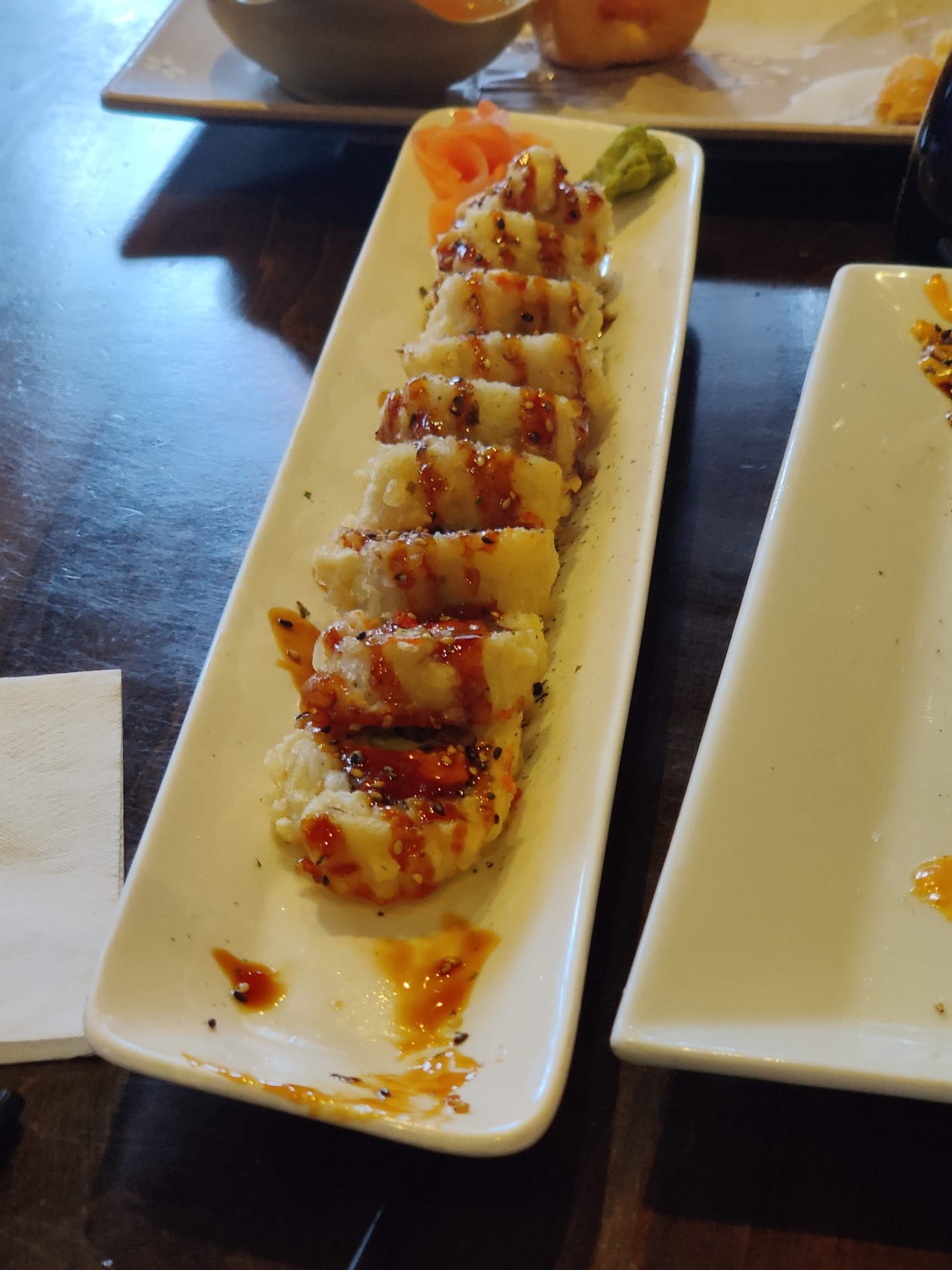 Secondly, our waitress, while she was polite, wasn't very competent in her job. Drink orders were fine, but when it came to ordering food, she couldn't tell us if we can modify rolls and had to run to the back once or twice to confirm. When we ordered our food, she placed two forks on a napkin on the table and waltzed off until our food arrived 25 or 30 minutes later. She didn't refill our drinks, until I started loudly wondering when the drinks will be refilled. Then the hostess came up and apologized and asked her to go and refill our drinks. When my husband was done with his food, yet we had some left over, I wanted to request a to-go box. I was looking for our waitress and spotted her at the front counter talking to someone while slumped and leaned over on the counter. So I had to go and grab the to go box myself. Only when I had done that did she even notice that I was doing something and rushed over.