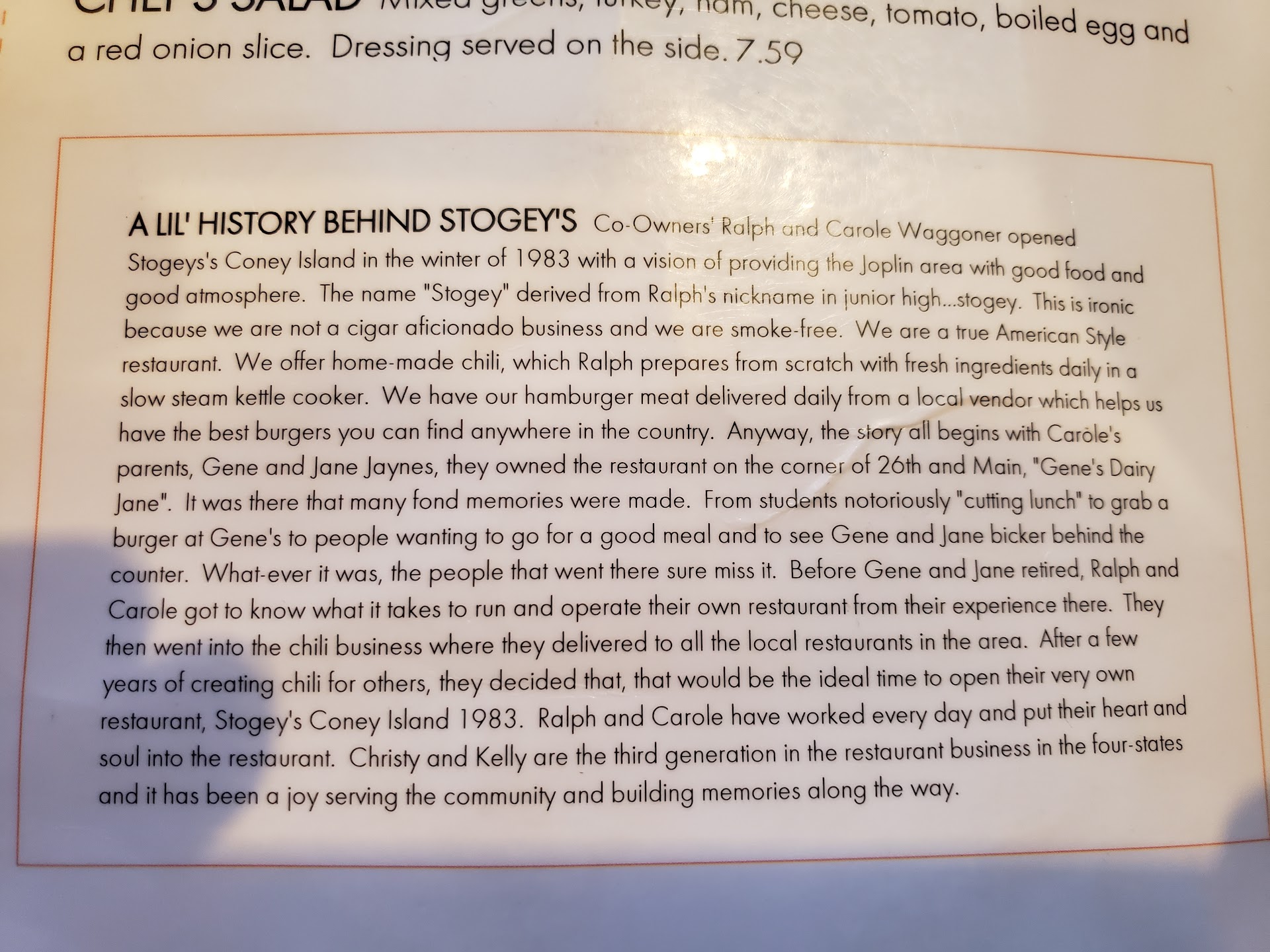 Read moreDrove past this place yesterday and it was PACKED. Told my wife we had to come in and see why. OMG! They have the BEST hamburger I've tasted in my life! Everything from the toasted bun all the way to the hand diced FRESH onions was prepared perfectly. The burger was cooked to the perfect level of doneness. This was not some frozen pattie. This was fresh meat hand formed to fit the bun perfectly AFTER cooking. My wife had a Philly Cheese Steak sandwich that was prepared just as perfectly as my burger. She doesn't eat peppers...so she just got onions...which were caramelized just right. Once again, the perfectly toasted bun. This would have been enough to get 5 stars...BUT...they offer 2 different styles of fries. Both served so hot you can hardly pick them up when your plate arrives. They also have chili and spaghetti....I MAY try one of those next time! I will make a point to visit Stogey's EVERY time...