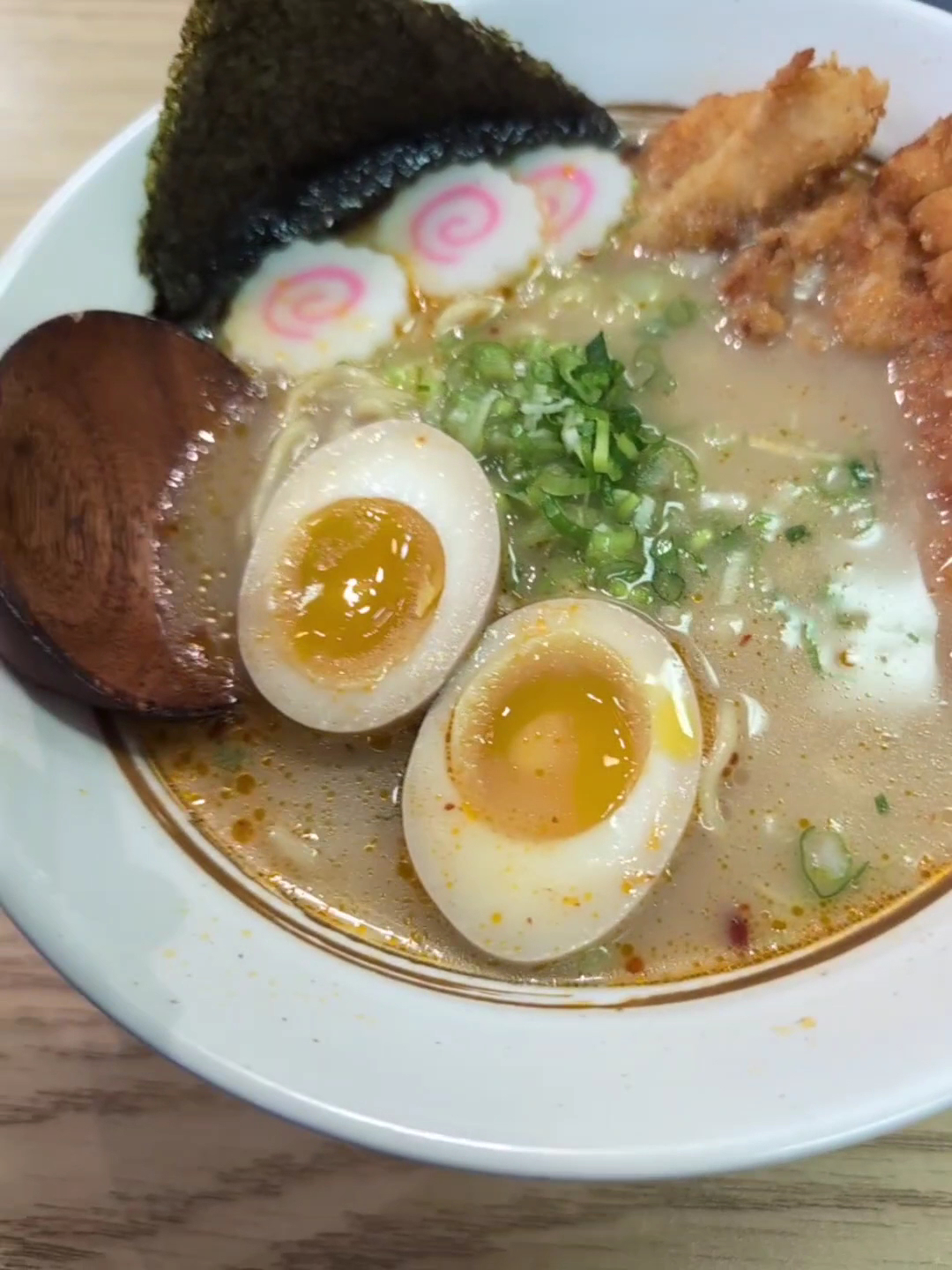 I had the Creamy Chicken Katsu Ramen which comes in a creamy broth w/ a marinated boiled egg, narutomaki and green onion and nori. ( Had to ask about what most of that was )