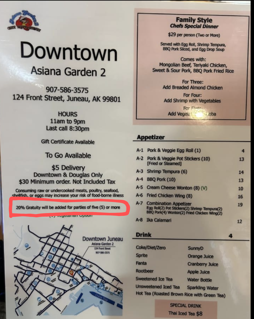Even though the menu clearly states that the restaurant only charges a 20% gratuity on parties of 5+ people, the worker charged me a nearly 22% gratuity. Surprisingly, she said that it was the law that all customers pay the tip. However, I took a picture of the menu to prove that the restaurant rules for tipping only apply to parties of 5+ people, not parties of one (1) person.