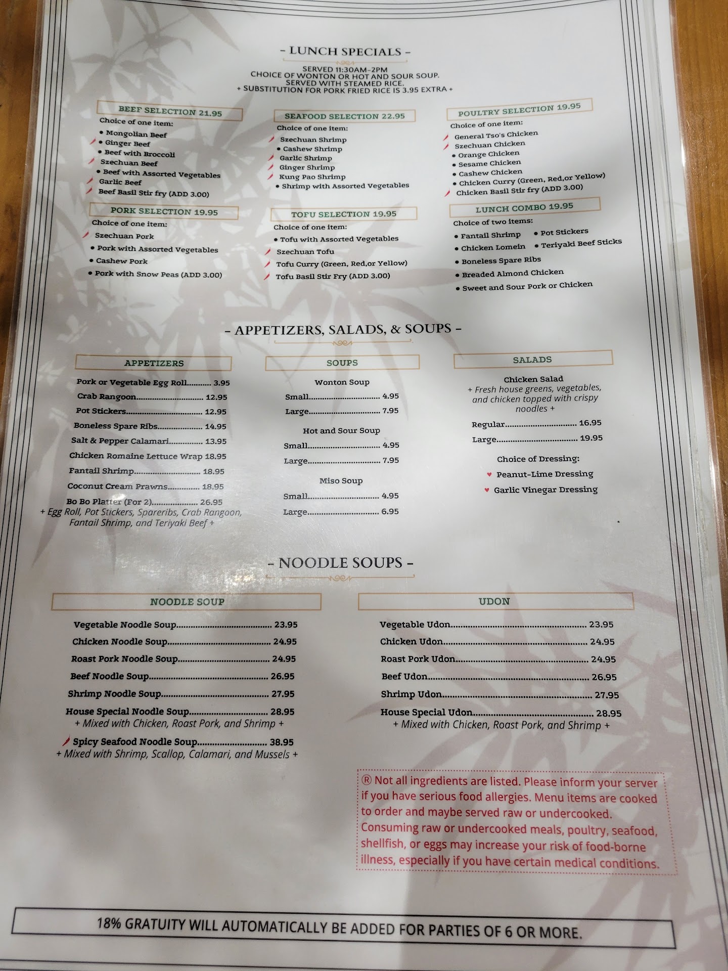 The Staff was great and very understanding, but I wasn't prepared for how different and less quality the food is. Menu tonight- Red Curry - This was just to different to enjoy, didn't eat it. The broth was foamy somehow, not creamy broth. As if they whipped it or something. No Thai chilies but substituted jalapeños, a few random whole basil leaves, large cuts of chicken and normally the lime leaf slivers for garnish ended up being a whole leaf cut in half. Dinner D - The fan tail shrimp - different cheaper tempura Teryki beef - to much sugar, sticky and like candy Sweet and sour pork - was this Sun luck brand? Nothing original here. The noodle thing - was ok The spicy tuna roll - the tuna was the mushy kind that cheap sushi places use, not the higher end tuna steaks cut into slices. It was not rolled tightly and the rice was somewhat warm... I thought sushi was a cold dish? Anyway... The guy serving was very cool about it, and I know it's out of his control, but the response was, "yea, we hear that a lot, it's like the flavor are all similar but it's just...