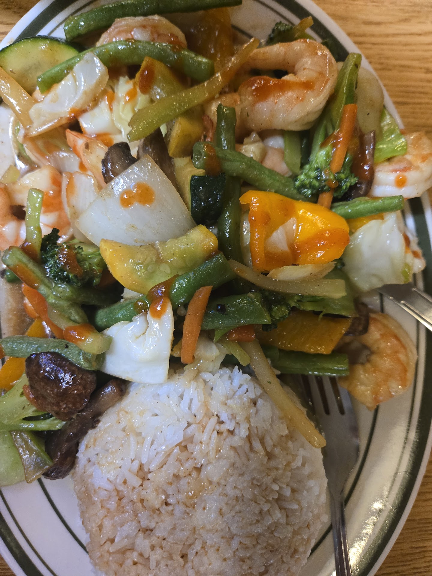 We ordered the ribeye steak cooked rare, one vegetarian egg roll, chicken potstickers. The vegetarian egg roll and the chicken potstickers appetizers both were very tasty, crispy exterior with sweet chili sauce for dipping. No soup of the day available, no vegetarian salad.