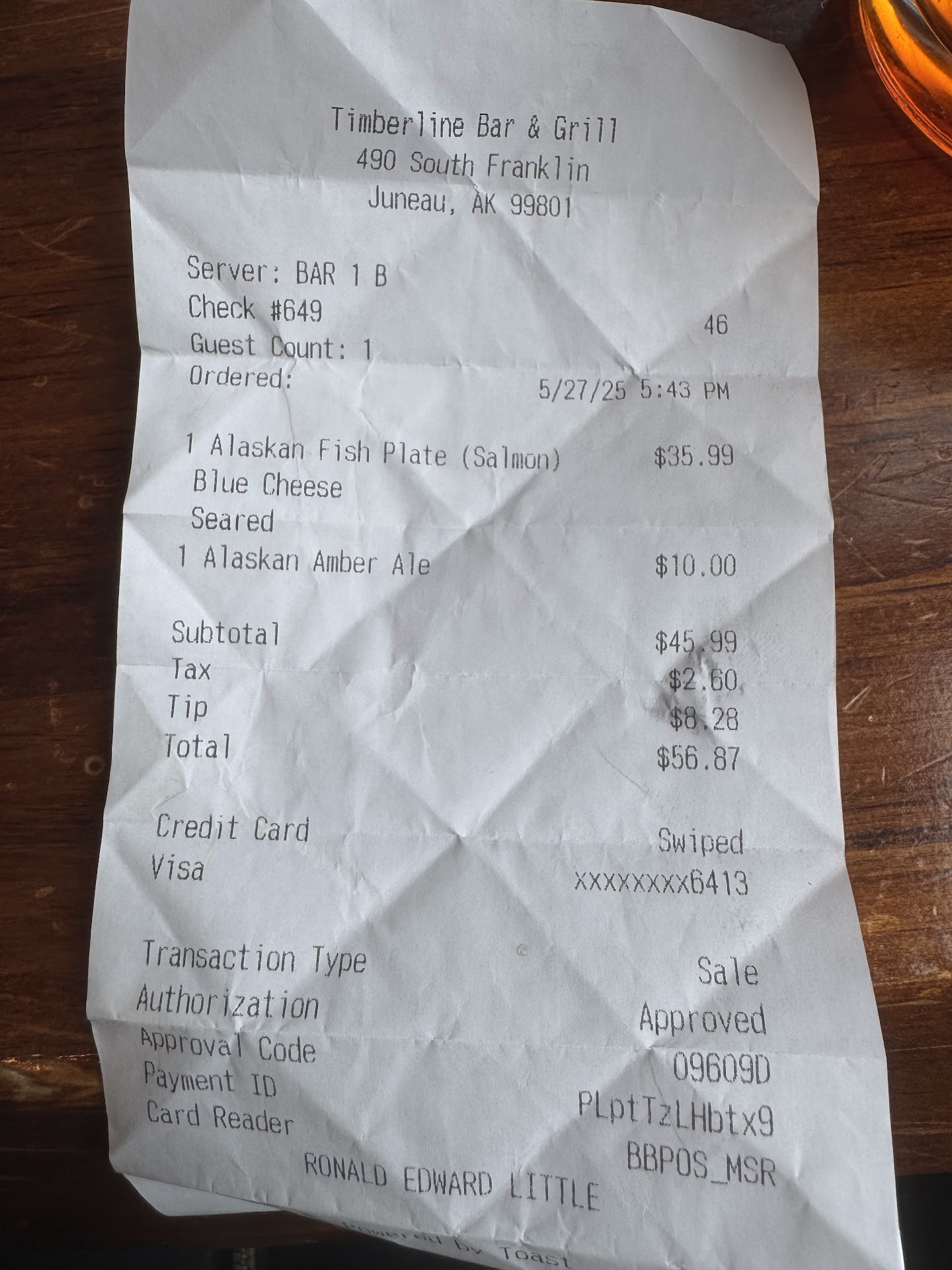Read moreOur stop at Juneau,Alaska was really amazing but finally will breathe taking we on the Goldbelt Tram to see a more spectacular view of Juneau and looking the beauty of Juneau. There's a restaurant called Timberline Bar & Grill on the top on monut. After looking the incredible view we were getting little bit hungry and the restaurant is just right there the restaurant looks very nice with Alaskan native art and totem including black bear and mountain goat hives on the wall very impressive. We were looking at the menu we were not that hungry we need a snack then we decided to get nachos Alaskan style.