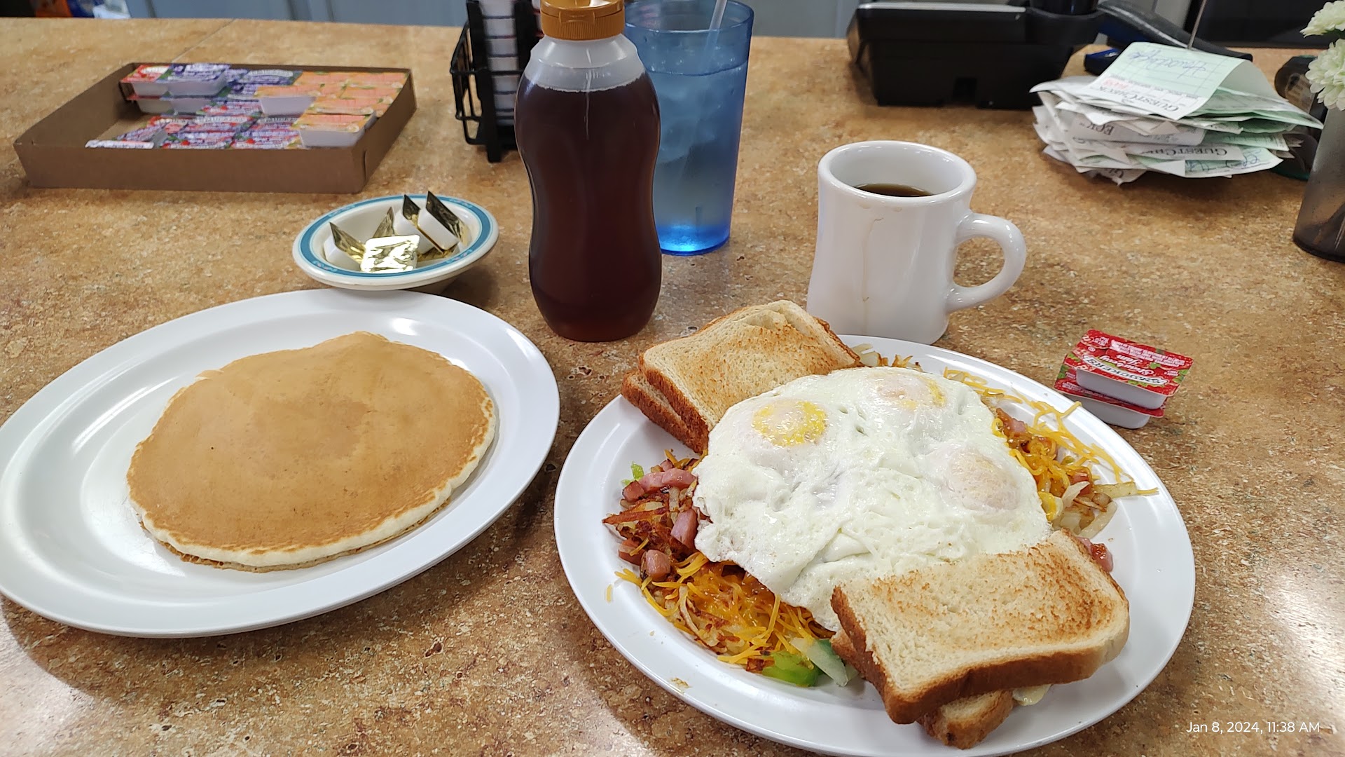 We had smiles on our faces whilst on the way to the car. Started off with a very nice waitress who was smiling and knew her job well. She took good care of us with a great attitude the whole time. The food was great as well. I had the special Polish Omelette and Kelly had Farmers Skillet. It was simple and delicious. Something to be said for an unpretentious place like this. The old guys and their blue hairs just whittling away at the morning. We felt at home. The only thing they could do better is maybe address the bathrooms construction. I almost offered to help (No longer a chef I am a contractor now) trade for more pie since…. The chocolate silk and coconut cream were both classics...