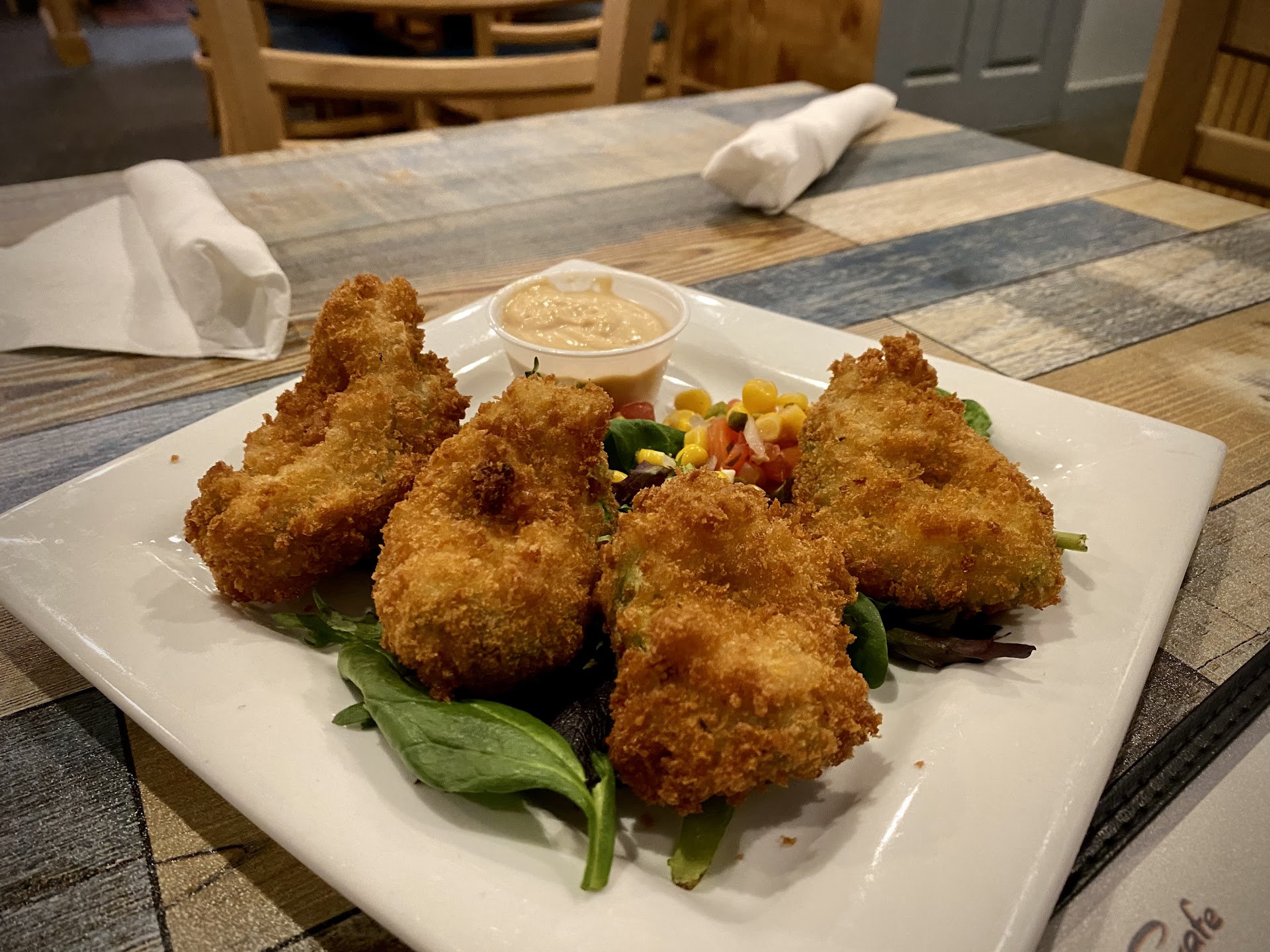 Read moreI hate to write a bad review and was so conflicted because this has been our favorite stop to eat after the beach but here it goes. When we arrived we had to wait to be greeted for a while and a young lady was running around super busy and she was all that was out front. We sat outside. We ordered our beverages which came out no problem and a gentlemen took our order. Here is where all went upside down. We order the calamari appetizer which we normally love and it came out after a long wait cold, rubbery, and extremely oily. It took nearly 15 mins for anyone to check in again and our original server never showed back up. The kind lady who was running around like a chicken was kind enough to take the appetizer back and put in another order for us. We waited another 30 mins before our replacement appetizer arrived and I was extremely hungry getting a French onion soup. It was extremely watery and oily and gave me a sick stomach afterwards but in the moment I was so hungry and shocked at such a bad couple meals. I still had hope for our meals. Then my daughter got chicken fingers literally drenched on oil there was a puddle on her plate that took up an entire napkin to wipe off. My meal was not seasoned well and my husband had rice in his meal that was not fully cooked. The gentlemen waiter came over after another 30 mins asking if all was okay and when it was shared how terrible the food was he did absolutely nothing and even debated stating that the soup was "fine to him" didn't offer to take anything off, didn't offer to have it remade, and put his hands up like he was unable to do anything. After nearly 2 years of this being our favorite place we sadly will not return. So heart broken at this terrible terrible experience and our stomachs are still suffering from the poor quality of food. Gave it two stars because at least the sweet...