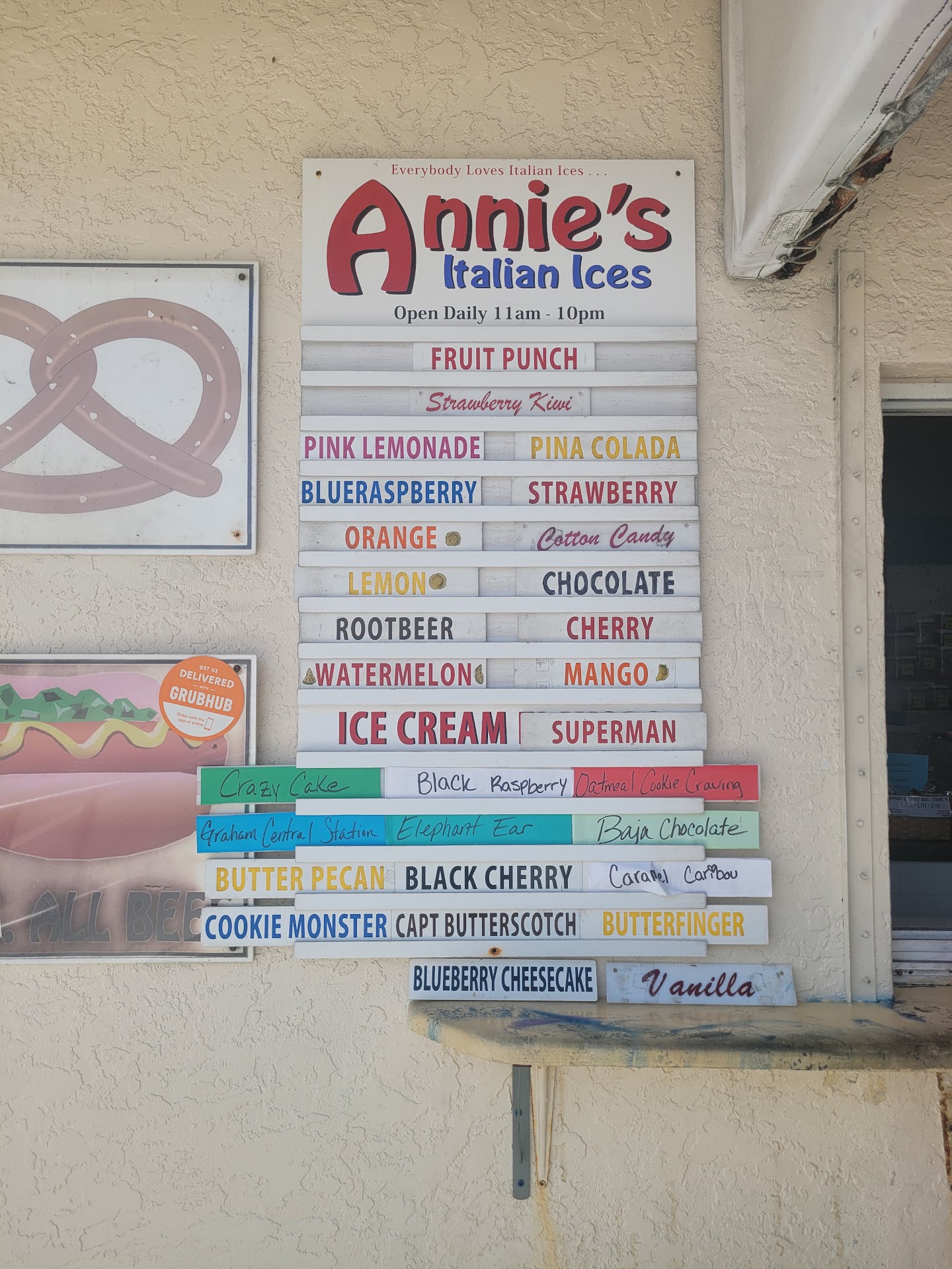Went here last night with my boyfriend because I was in the mood for Italian ice. It's been a long time since Maria's Italian Ice in Lake Park closed down, and my family used to love going there because it was the best. It's been hard to find anything that came close to the same quality, but Annie's Italian Ices brought all those memories flooding back. The flavors for the Italian ices are the perfect balance of strong and delicate, and they're incredibly smooth almost to the point of being creamy. Most places leave large chunks of ice because they don't shave it down as finely as Maria's did and Annie's does. I got the "melon ball" flavor and chocolate. (The flavors didn't mix well together but it was easy enough to enjoy them individually haha.) They layer custard in the middle and on top, which was a pleasant surprise! The creamy custard with the flavored ice is a lovely combination. The ladies behind the counter were kind and patient with us sampling all the flavors we were curious about. We had asked to sample a flavor that I didn't know was actually ice cream and not an Italian ice, but I wasn't complaining! They even recommended their "Graham Central Station" ice cream. My boyfriend and I loved that flavor and have never had anything quite like it ever before! The ice cream base tasted of honey and cinnamon, there were soaked/soft (not at all soggy) graham cracker pieces to enjoy, and there was also what seemed like super tiny pieces of a Crunch bar in there (crispy chocolate bits). He got that with either cookies and cream or chocolate chip cookie dough (we were so impressed with the graham cracker one that I don't even remember the second flavor haha). The ice cream looked like it's going to be hard or too firm, but instead it's so silky and velvety and soft. Not "soft-serve" soft, but like how the perfect futon mattress is firm yet soft. Other places' ice cream is usually too hard/stiff/iced over and it's not a great experience when that happens. The quality of the treats at Annie's is absolutely out of this world! Not to mention that the staff are extremely kind, considerate, patient, and overall pleasant. After working food service myself, I can tell they were just genuinely, sincerely nice people and weren't just putting on a fake smile. They seemed really delighted to do what they do. They made the first-time visit for me and my boyfriend absolutely unforgettable, he was so happy to see me tear up with delight as we got to share something that was always such a special treat for me growing up. I will absolutely make many return trips with each of my friends and family members. This place is a gift for my soul and has honestly restored my faith in humanity a little bit with, especially with everything that's been going on in the world these past few years. Thank you so much, ladies! ♥