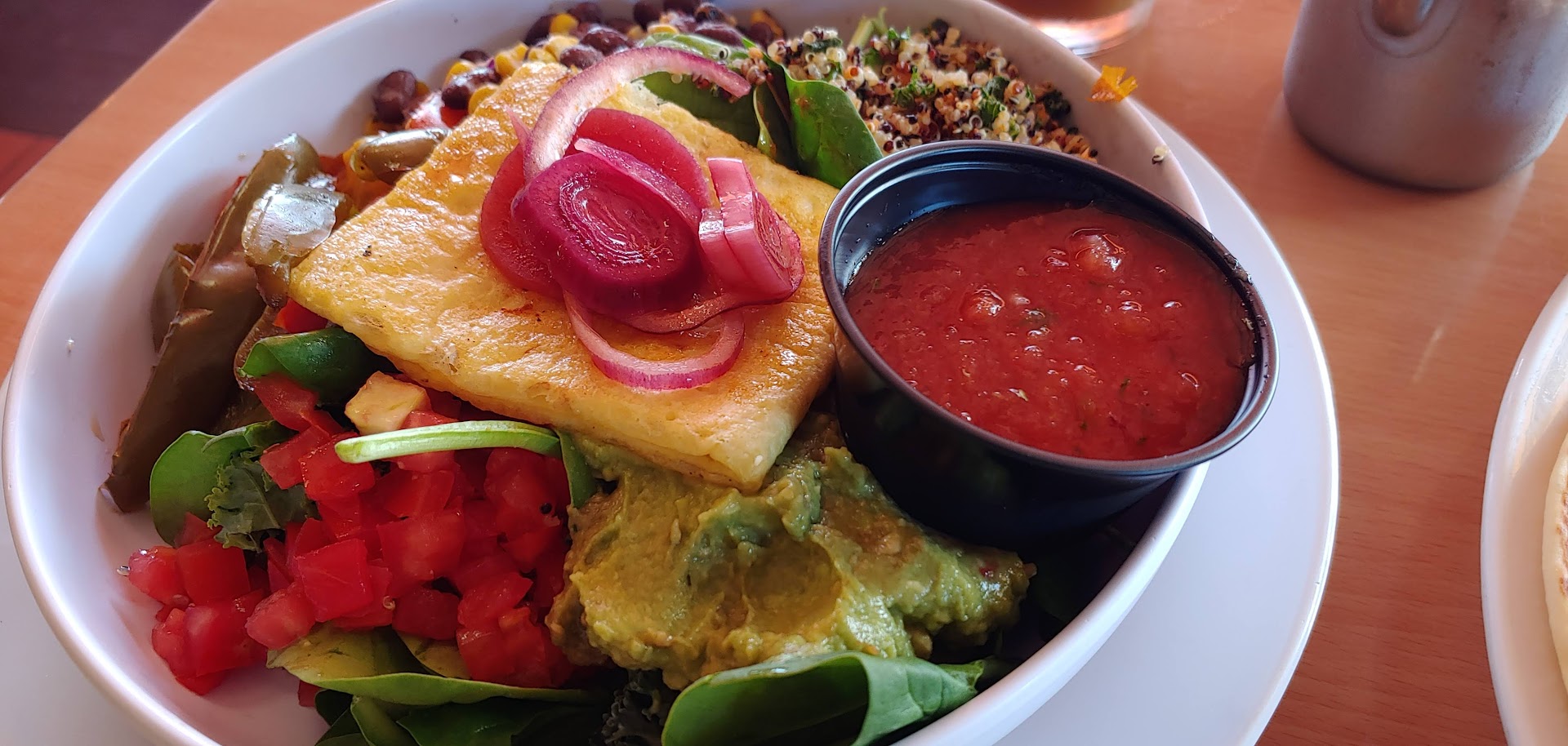Nevertheless, my server was very nice! They have a separate vegan menu; what's labeled on the regular menu as vegan doesn't seem to always line up as being an option. So I felt things were not so straightforward menu-wise. I ordered the vegan pancakes, Buddha bowl, and coffee. My server was knowledgeable, patient, and attentive. The pancakes are good; the Buddha bowl is okay though it has a decent presentation. My server offered a to-go coffee as well, which was nice of her. She increased the experience as positive and did not rush me, although I did finish before three other tables. I would go back again to try different dishes and give them more chances as I usually have a three-strikes policy unless an establishment messes up. So go check them out, try the pancakes; I would add something to them, like blueberries; they are kind of dry without any fruit inside.