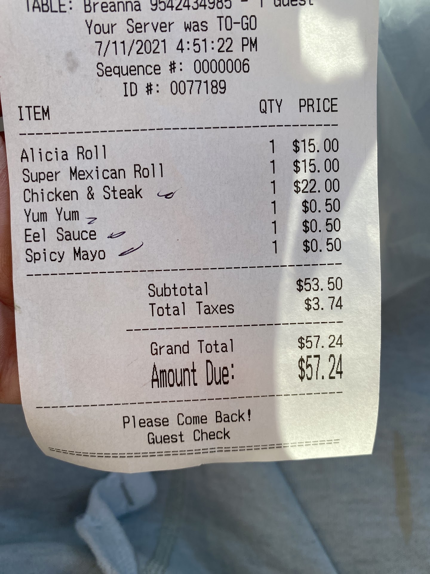 We ordered here because conveniently both our 2 normal sushi spots were closed so we thought weâd give it a try. WARNING: The service is soooo slow. My husband and I ordered take out tonight. Sunday night, so we figured weâd beat the evening rush and rang in exactly at 4:59p. We order 2 sushi rolls and 1 basic hibachi dinner, thatâs it. They told us 45 min. At first I thought hmm thatâs kinda long for a pick up order usually itâs 20-25 min. But I gave them the benefit of the doubt. I thought itâs Sunday night, after covid, with 2 other local sushi competitors closed (they normally arenât closed on Sundayâs) I figured buisness is probably popping.