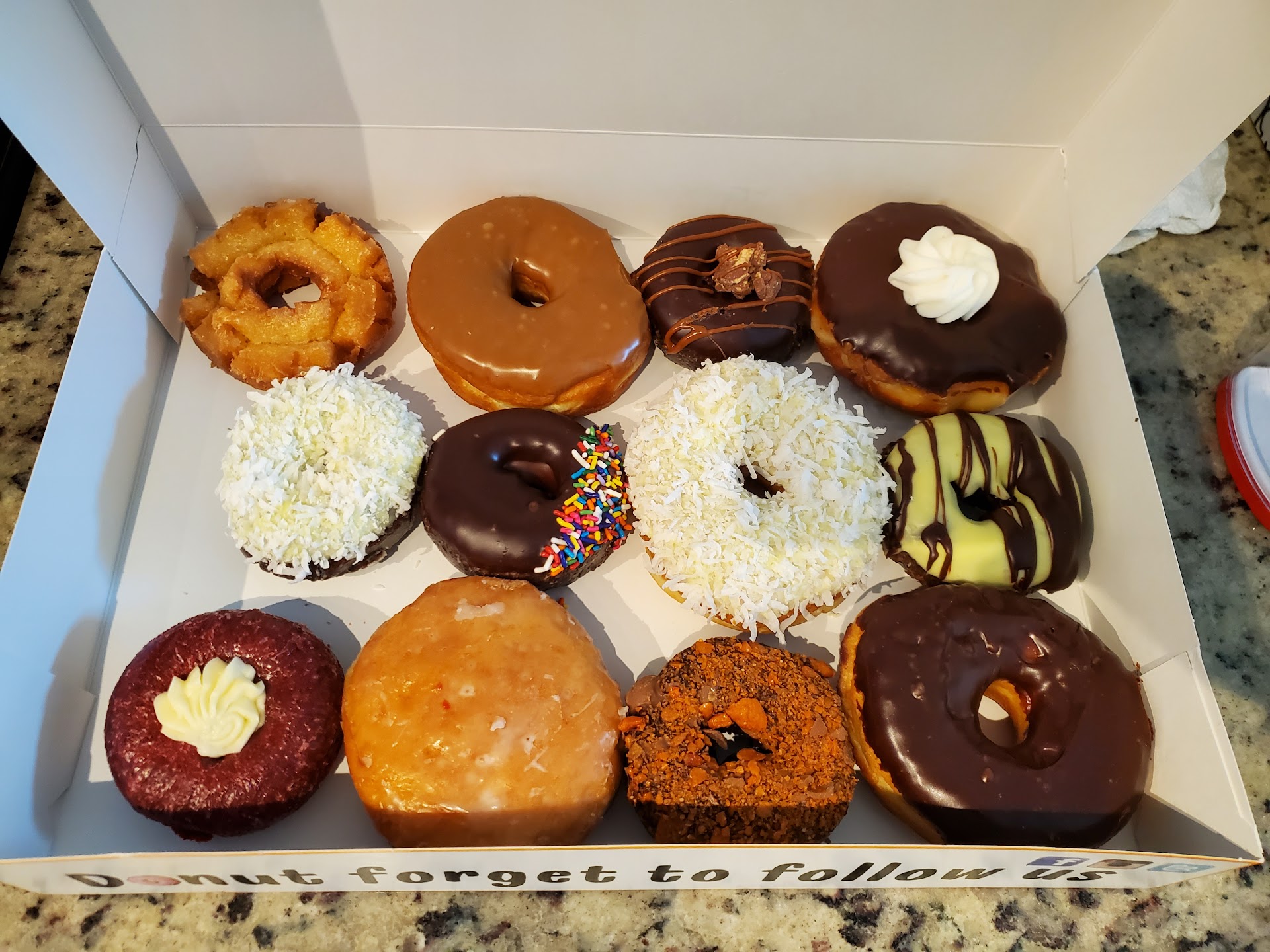 They always have a great selection of cake and yeast donut classics and more updated varieties that feature the likes of candy or breakfast cereal toppings. For example, they make a great "old fashioned" and banana chocolate cake donuts, and the raspberry and chocolate glazed yeast donuts are to-die-for! Then you can always get Snickers or Butterfinger topped donuts which at some childhood nostalgic decadence to the flavor party. Really, you can't go wrong.