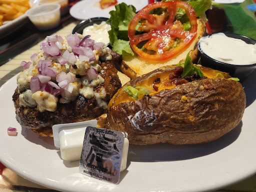 As far as what was ordered today in my party, we got the Tower of Onion Rings, The Bacon Cheese Fries, #34. Black & Bleu Burger w/ loaded baked potato (I made it a 10 Oz/Pictured), #20. Dagwood, #35. French Fry Bourbon, and the children's 2 mini burgers. As far as the appetizers the onion rings were better than I remembered. They had a nice simple mild flavor with a nice batter and the onions where crisp so you didn't have to worry about yanking the whole onion out of the batter in one bite. It was served with their "signature tiger sauce" and it was similar to a gently spiced ranch with good balance. Their bacon cheese fries were delicious, the cheese that they used gave a nice gooey coating and I didn't feel like they skipped on it either. Every fry on the plate had cheese on it and that is kind of hard to get lately. The burgers were all juicy cooked perfectly to temperature, well seasoned, and the buns were nice and soft. My 3 year old daughter, who has been fairly difficult about finishing her dinner lately ate every last bite and asked for more. I typically provide more pictures in my reviews but it all looked so good and I kept digging into everything before I could get a picture!