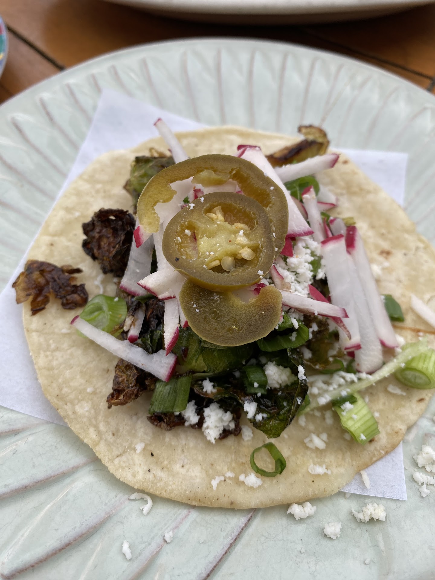 Basically everything I have ever ordered has been fantastic and we have been back multiple times. The tacos are always great - I always wind up able to pick two that beat a third one, but even the "loser" is good. Today I had the spare rib taco (birria), the Brussels sprouts taco (repollito), the tuna poke tostada, and the street corn. The repollito was today's "loser" but it was still quite good. It just couldn't measure up to the spare ribs with melted cheese and broth to dip it in or the awesome fusion of the tuna. The street corn was served in thirds of a cob, each on their own skewer which made it easy to share (though I didn't) and less messy to enjoy. Delicious seasoning, good texture. I also shared the yucca fries which I had had before - delicious. My husband had the short rib empanada, puerco, and barbacoa tacos (ordered without cheese), plus his favorite Smoke/Chill cocktail. There was about a fifteen minute wait for our table, but the waitlist viewing feature here on yelp made that super easy. We were seated at a giant table outside, felt like there was lots of room around us. Bonus, everyone brought their dogs today so we got to see no less than 7 adorable doggos parade past us, all very well behaved and sweet. Both inside and outside tables are great. When it is hot they have fans mounted everywhere to turn on. Today was nice and cool - fans and umbrellas not needed. Bathrooms have the best flamingo wallpaper. If you're into mirror selfies wear something that goes good with black, hot...