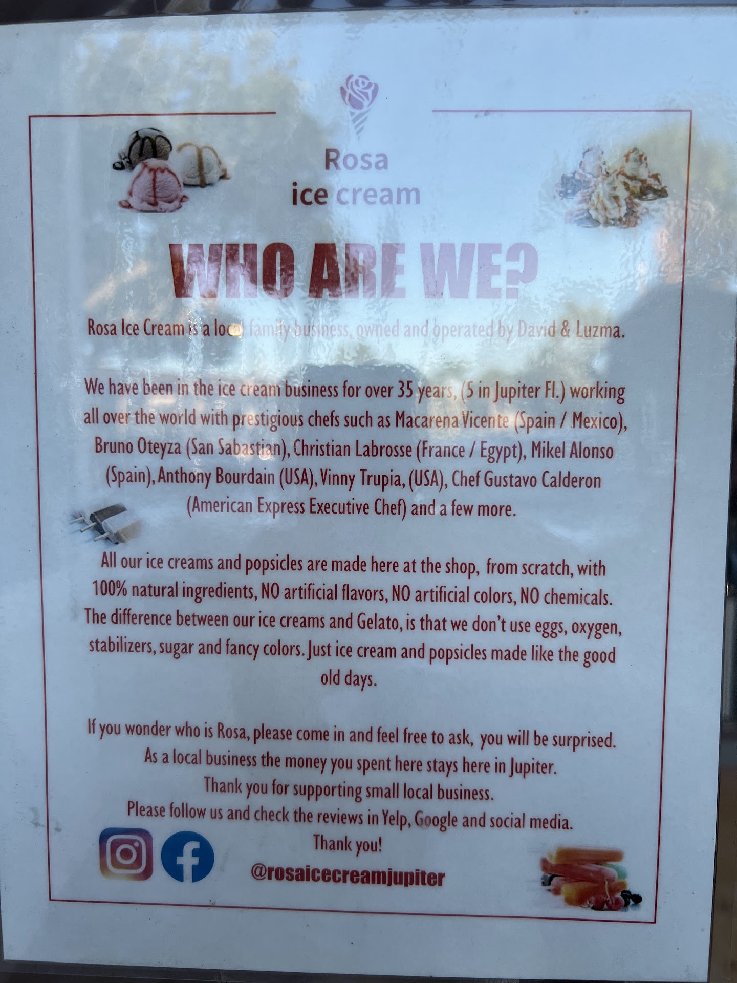 Read moreThis place Is a gem in Jupiter! Just met Mr Rosa and his son Emiliano yesterday. They are super nice and they know how to mix delicious flavors. Whether you love tropical flavors (like I do) - mango, pineapple, guava, tamarind, banana, and so many others, or if you just love a delicious chocolate, vanilla, coffee, pistachio...you need to stop in! They have cups, cones and ice creams bars that you can take home to your freezer! We tasted a bunch of flavors, all delicious, and we bought several of our favorites in pop form to take home. They will make any flavor you can come up with. They also supply the ice cream to Guanabanas and other restaurants in the area - which is great. I Love Rosa Ice Cream! Treat yourself and support a local...